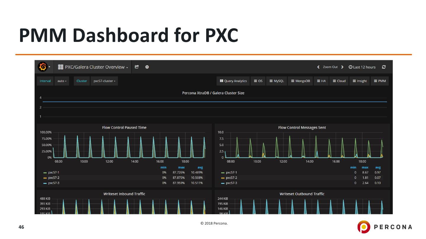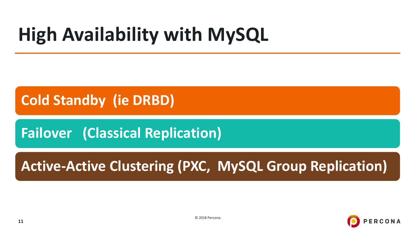 11 .High Availability with MySQL Cold Standby (ie DRBD) Failover (Classical Replication) Active-Active Clustering (PXC, MySQL Group Replication) © 2018 Percona. 11
