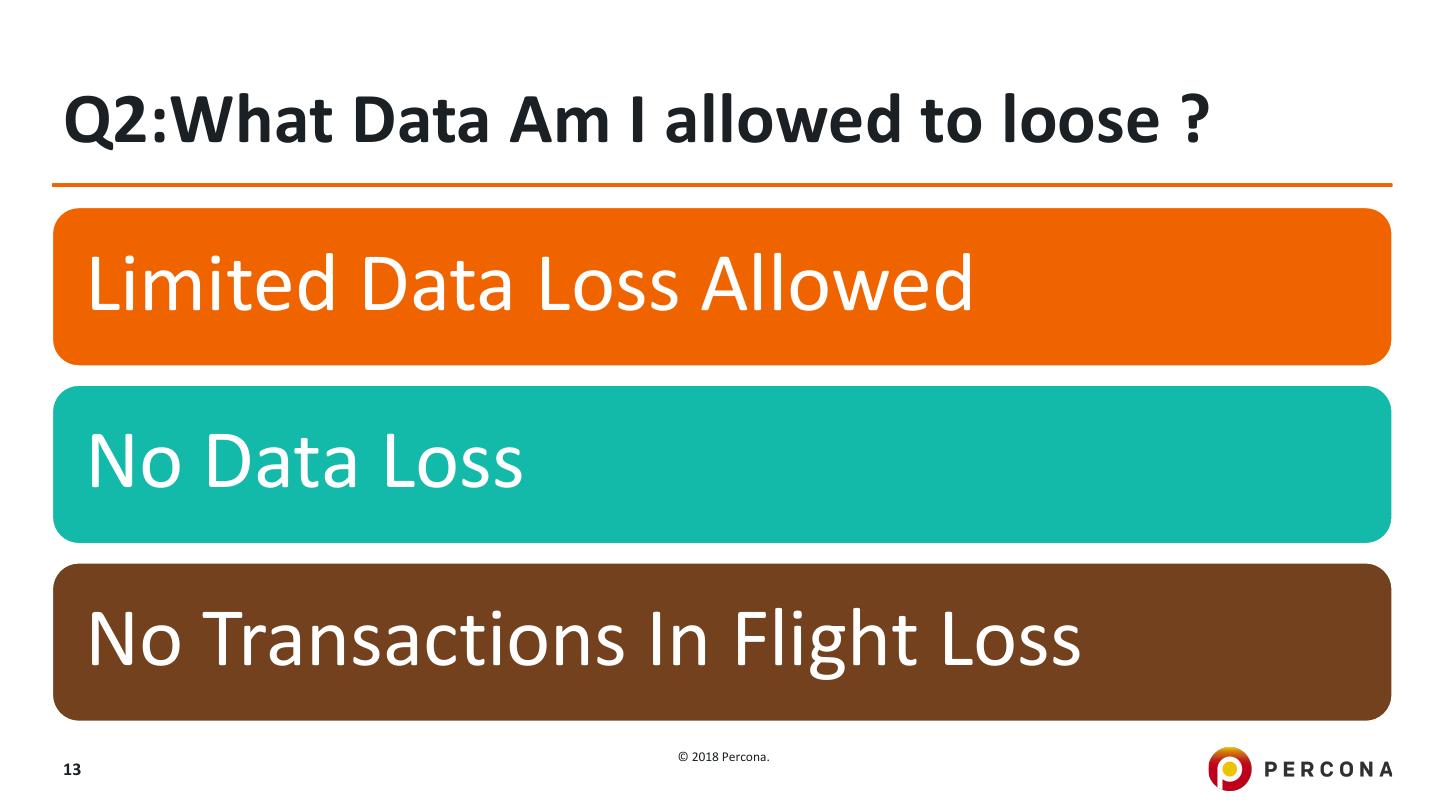 13 .Q2:What Data Am I allowed to loose ? Limited Data Loss Allowed No Data Loss No Transactions In Flight Loss © 2018 Percona. 13