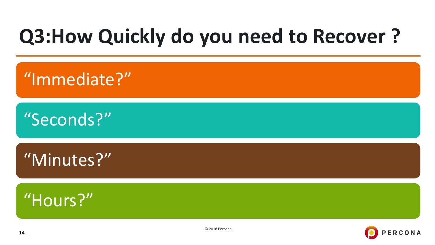 14 .Q3:How Quickly do you need to Recover ? “Immediate?” “Seconds?” “Minutes?” “Hours?” © 2018 Percona. 14