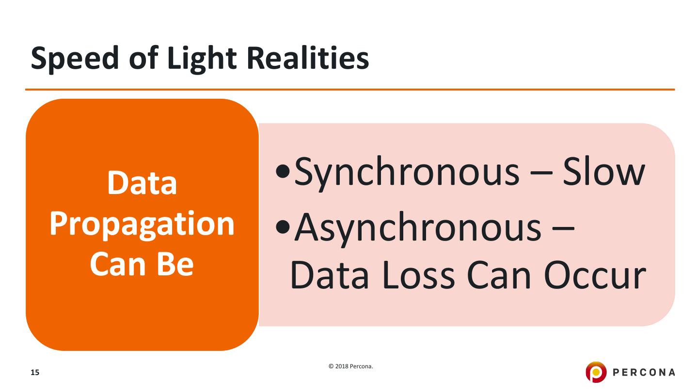 15 .Speed of Light Realities Data •Synchronous – Slow Propagation •Asynchronous – Can Be Data Loss Can Occur © 2018 Percona. 15