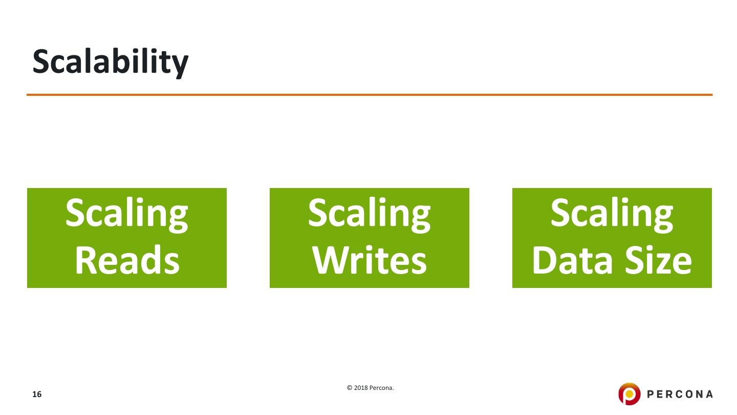 16 .Scalability Scaling Scaling Scaling Reads Writes Data Size © 2018 Percona. 16