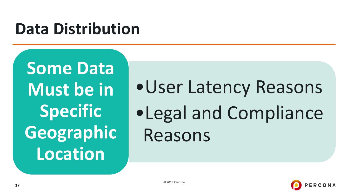 17 .Data Distribution Some Data Must be in •User Latency Reasons Specific •Legal and Compliance Geographic Reasons Location © 2018 Percona. 17