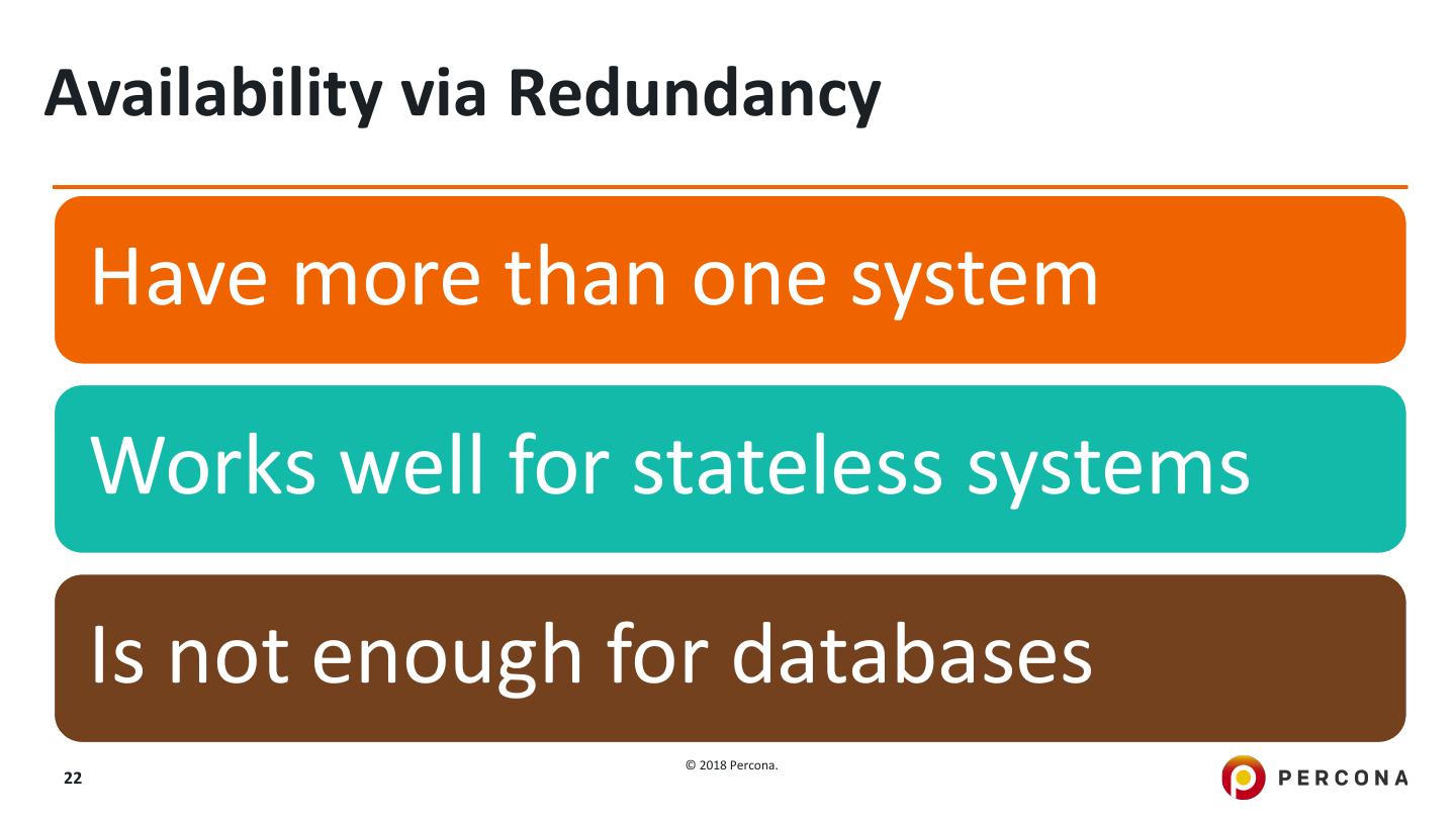 22 .Availability via Redundancy Have more than one system Works well for stateless systems Is not enough for databases © 2018 Percona. 22