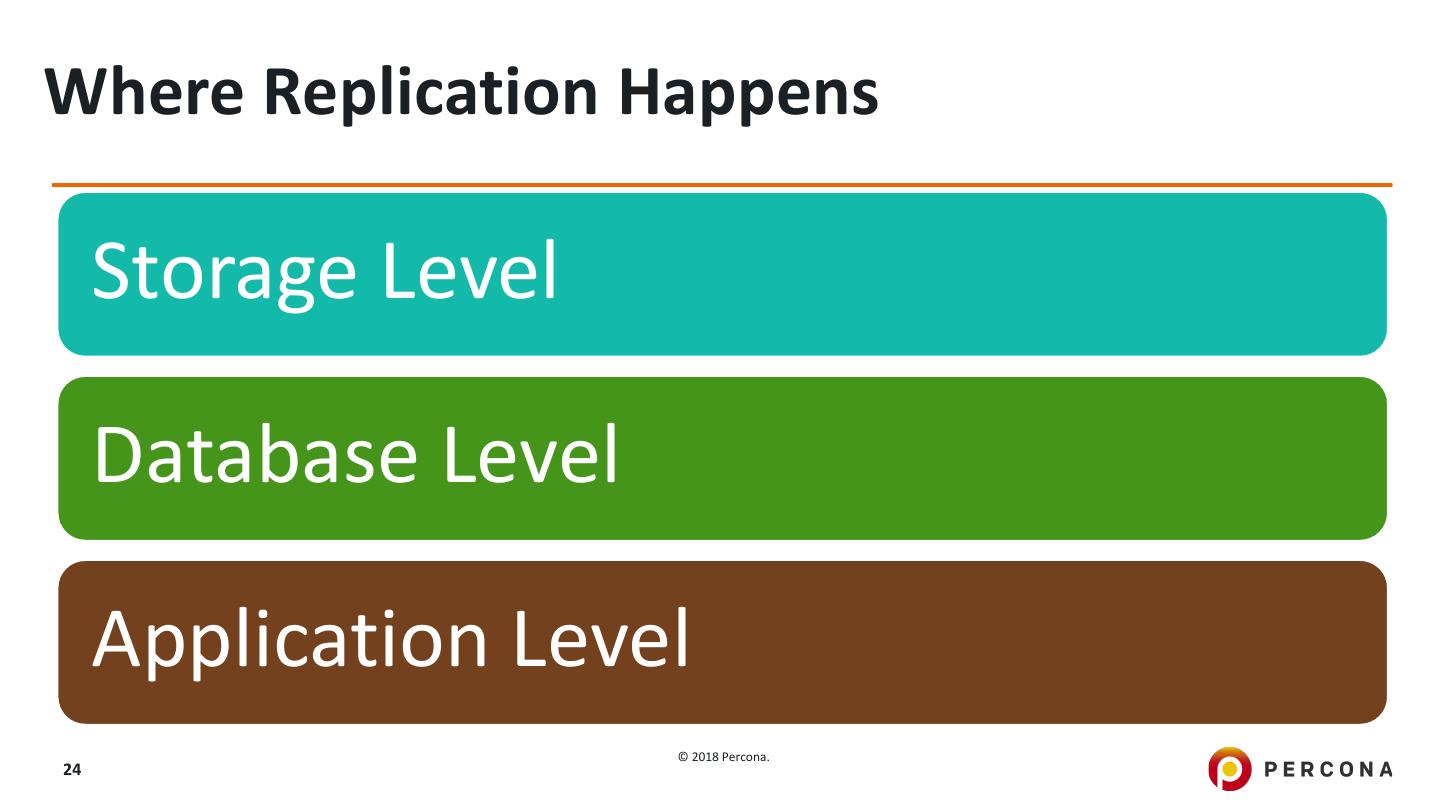 24 .Where Replication Happens Storage Level Database Level Application Level © 2018 Percona. 24