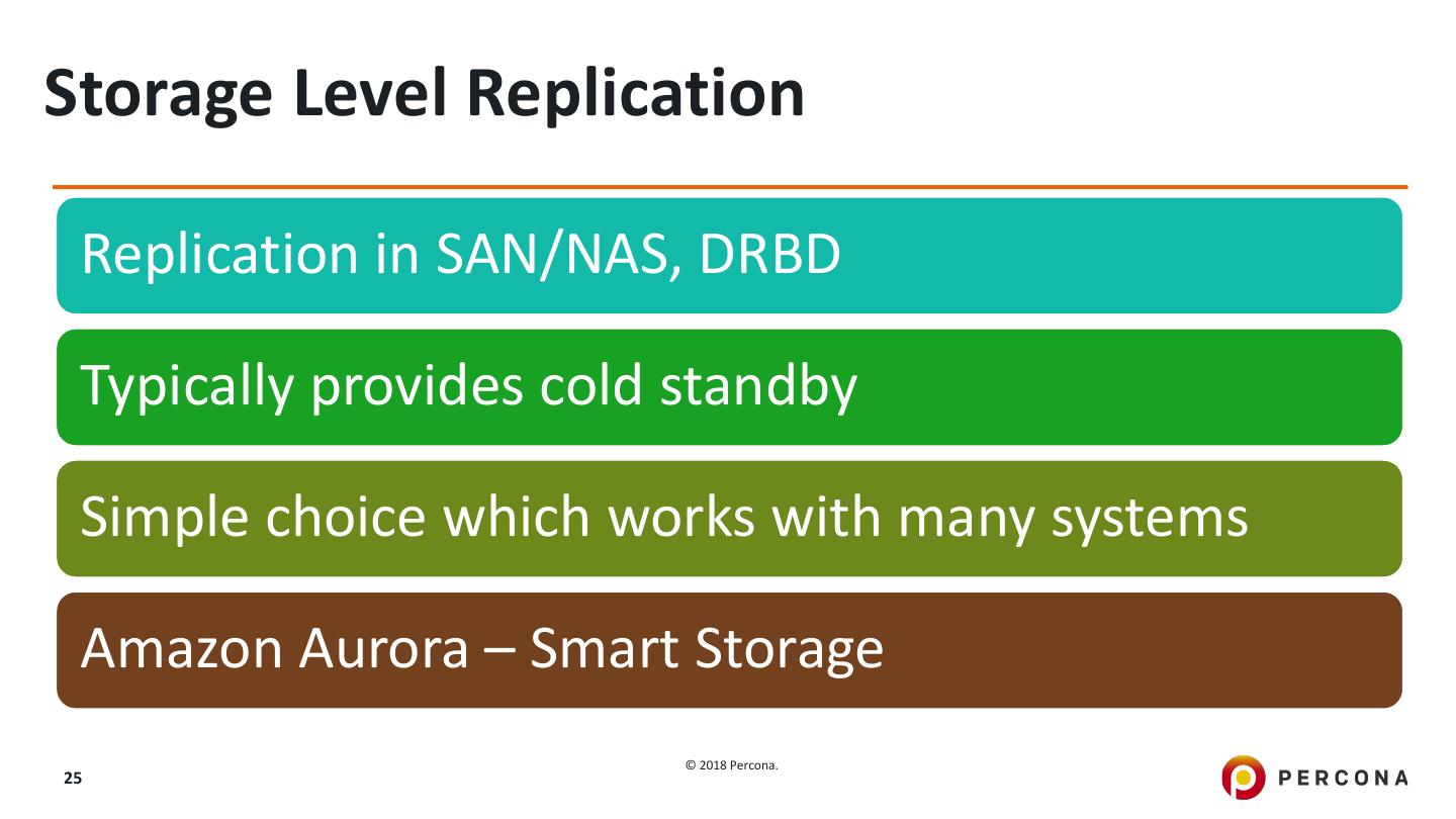 25 .Storage Level Replication Replication in SAN/NAS, DRBD Typically provides cold standby Simple choice which works with many systems Amazon Aurora – Smart Storage © 2018 Percona. 25