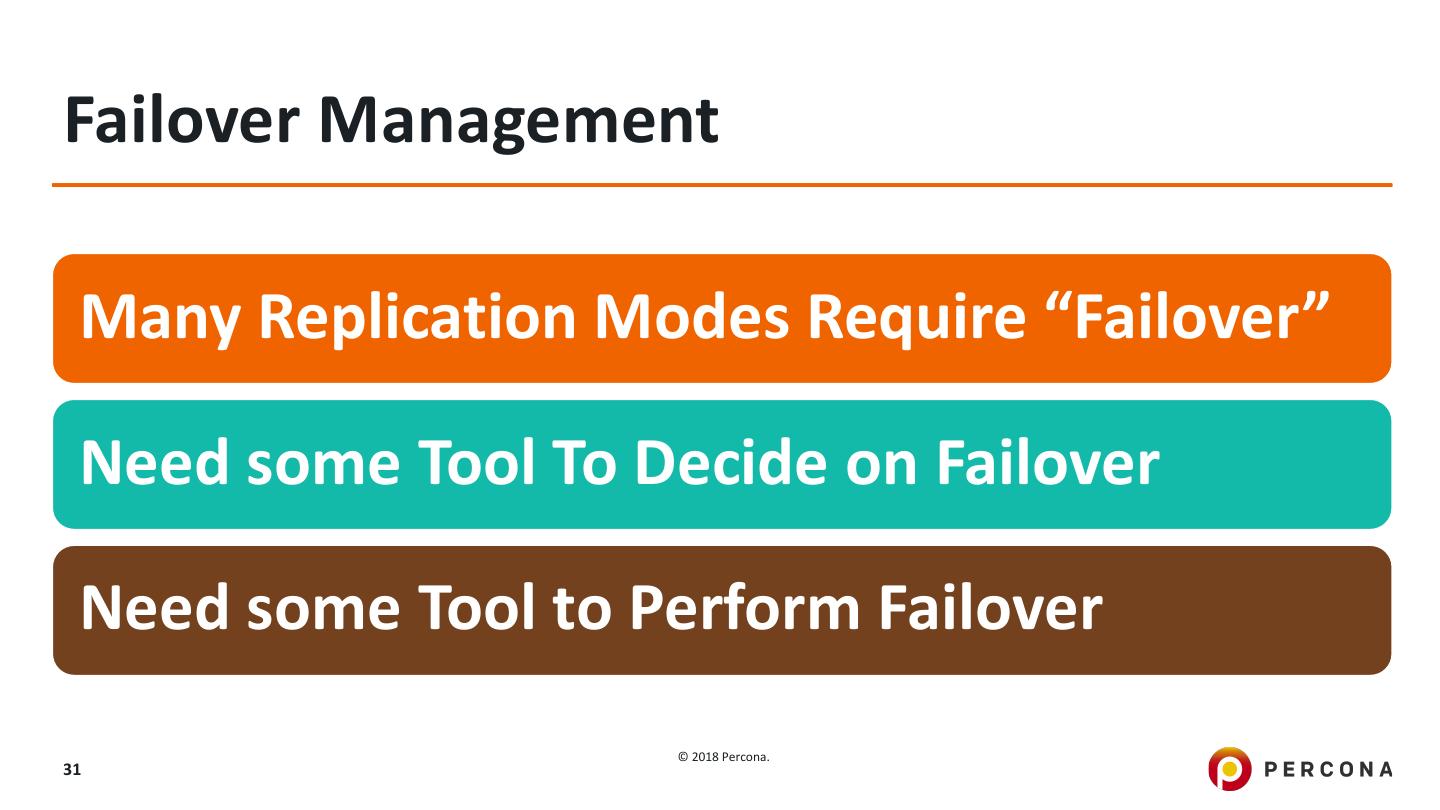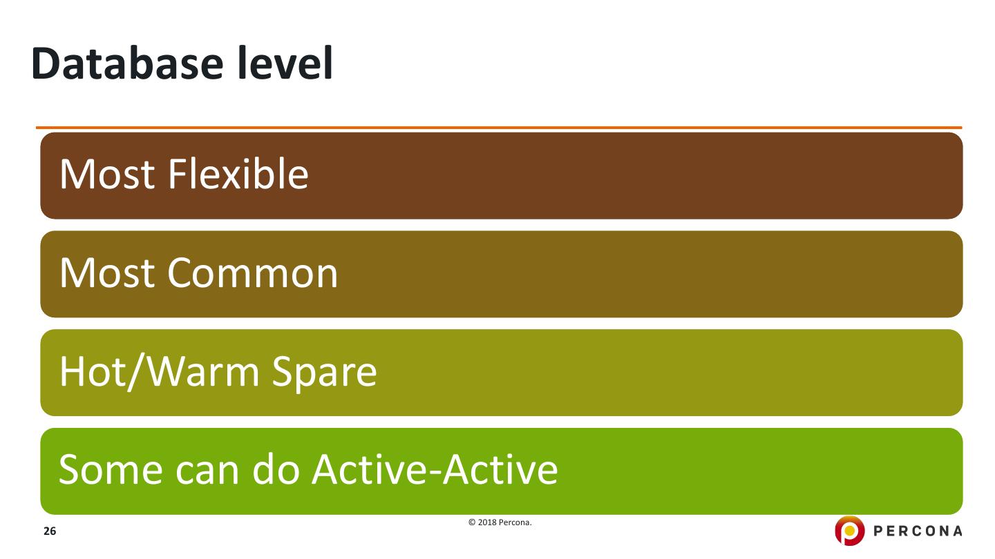 26 .Database level Most Flexible Most Common Hot/Warm Spare Some can do Active-Active © 2018 Percona. 26
