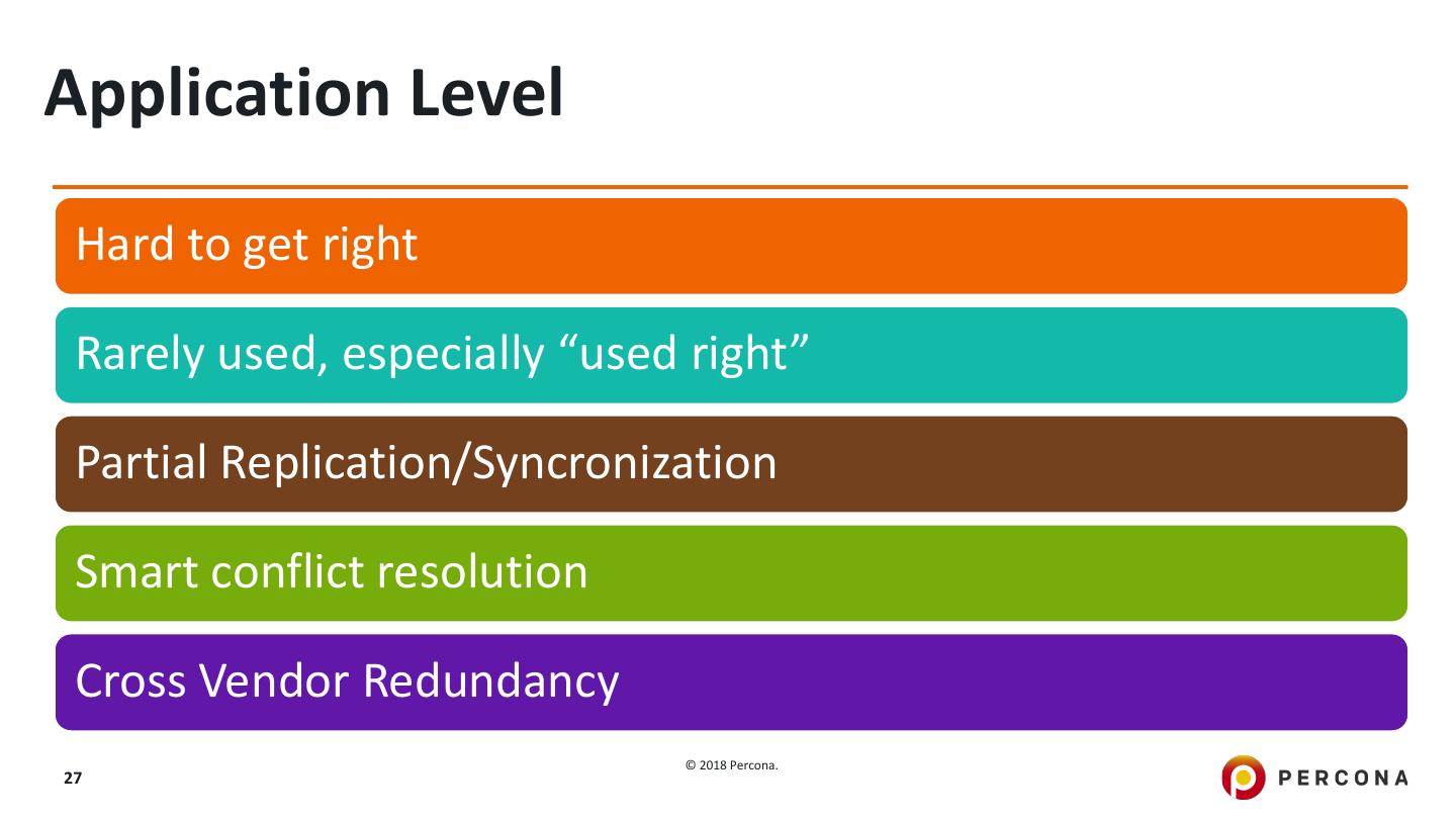 27 .Application Level Hard to get right Rarely used, especially “used right” Partial Replication/Syncronization Smart conflict resolution Cross Vendor Redundancy © 2018 Percona. 27