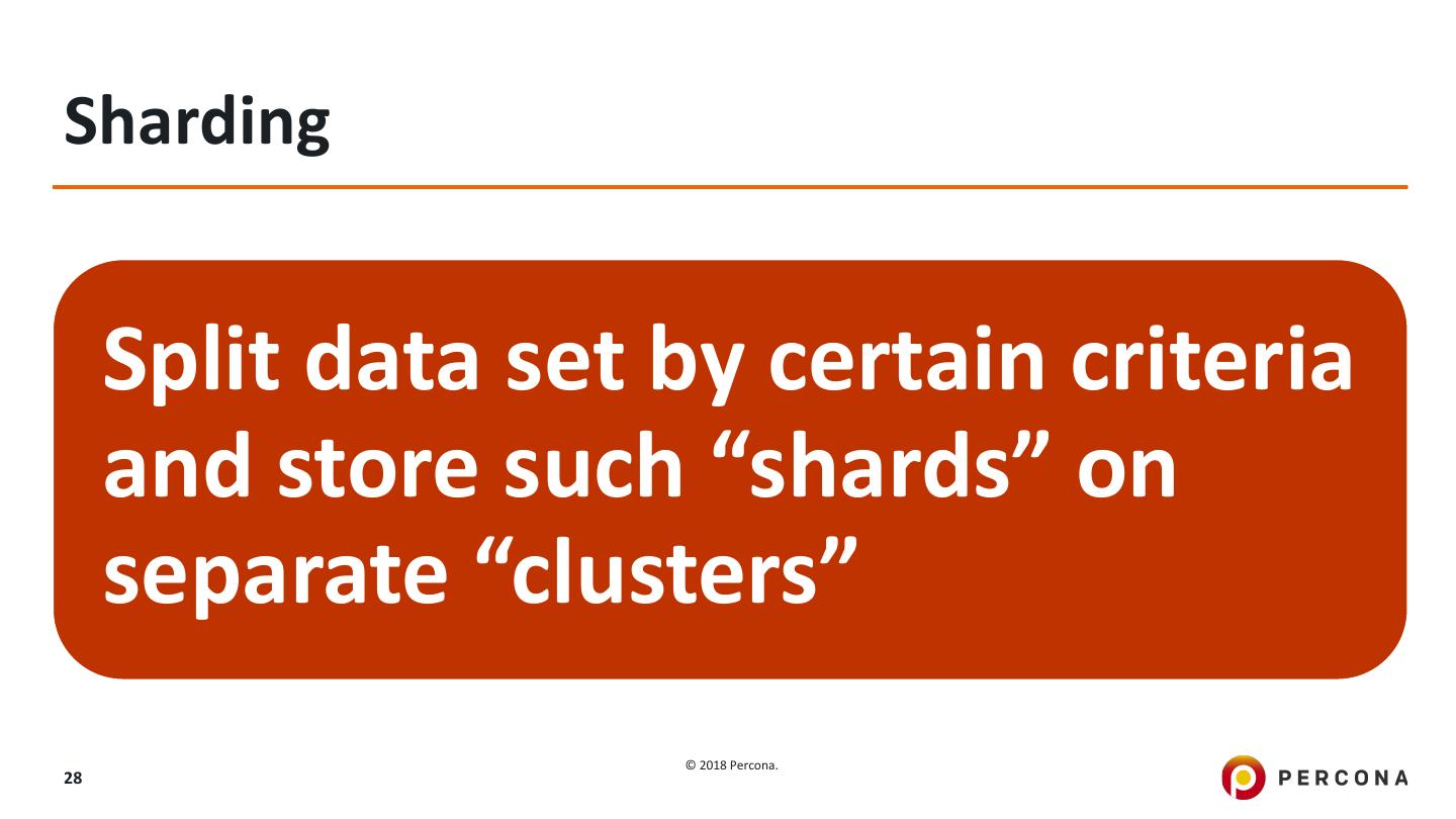 28 .Sharding Split data set by certain criteria and store such “shards” on separate “clusters” © 2018 Percona. 28