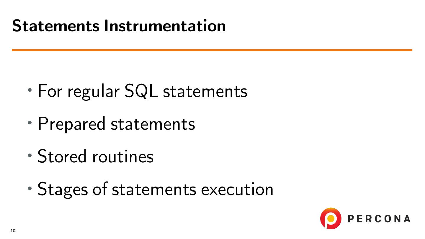 13 .Statements Instrumentation • For regular SQL statements • Prepared statements • Stored routines • Stages of statements execution 10