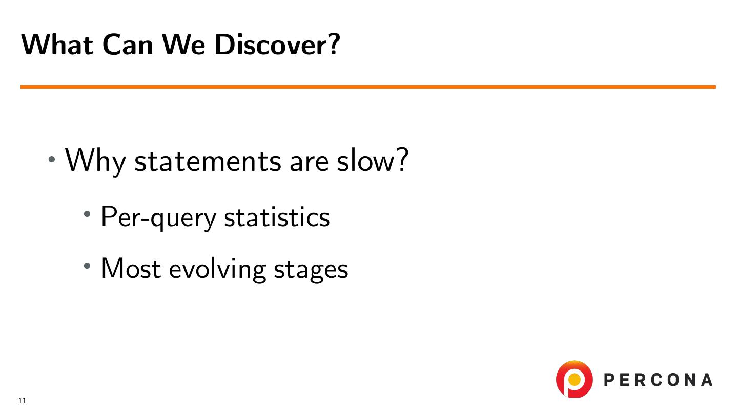 14 .What Can We Discover? • Why statements are slow? • Per-query statistics • Most evolving stages 11