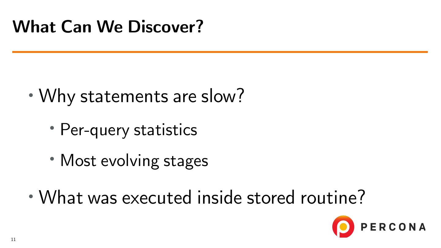 15 .What Can We Discover? • Why statements are slow? • Per-query statistics • Most evolving stages • What was executed inside stored routine? 11