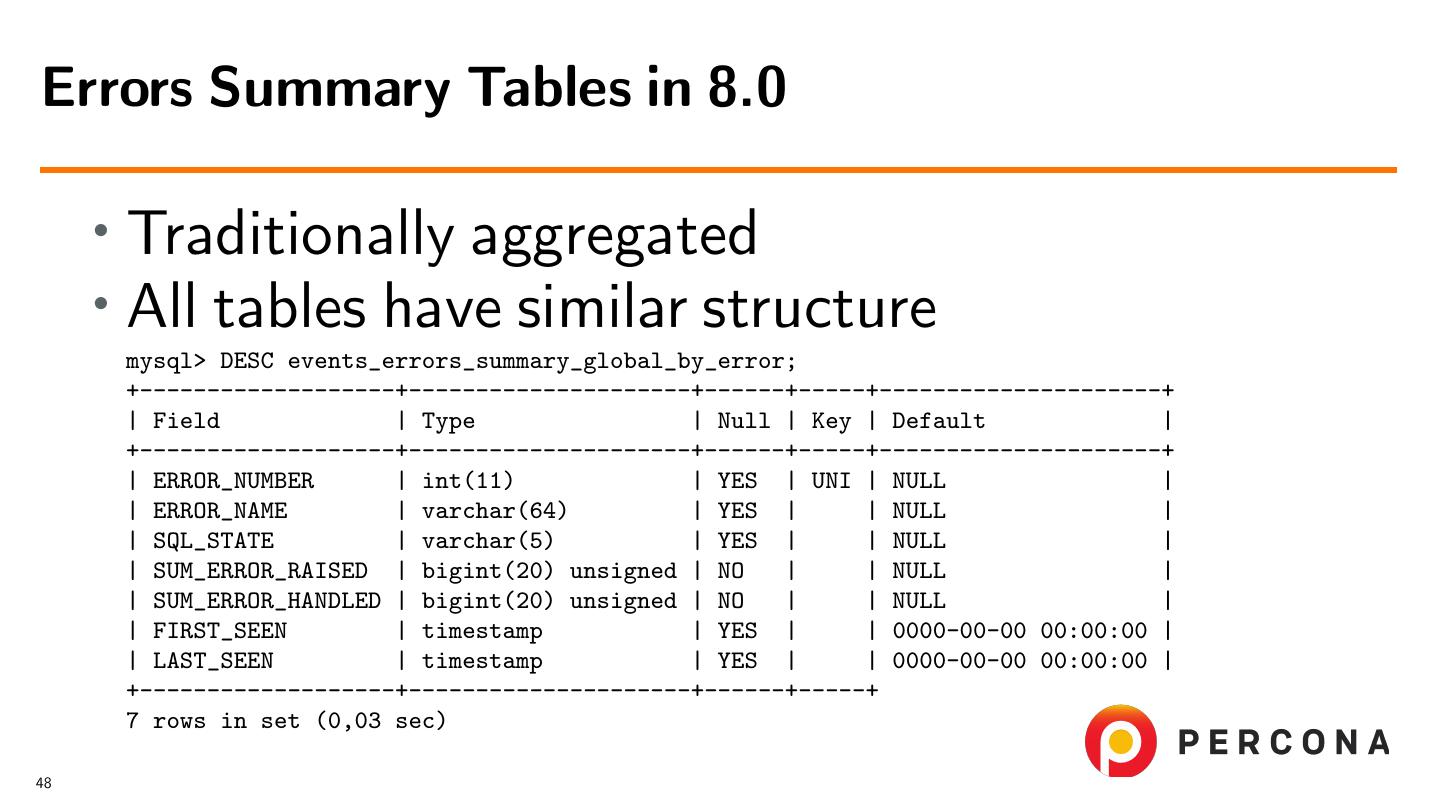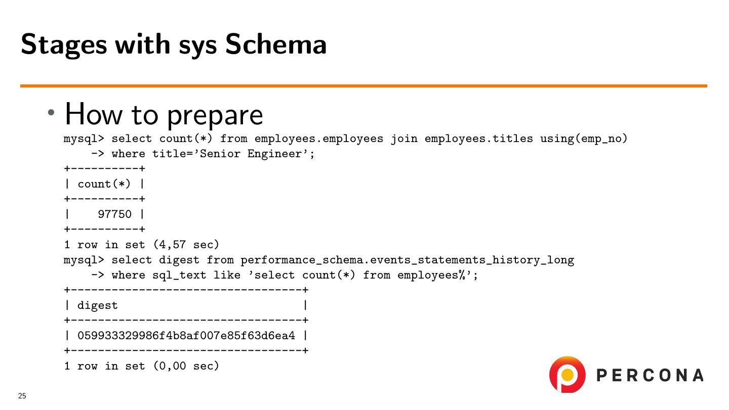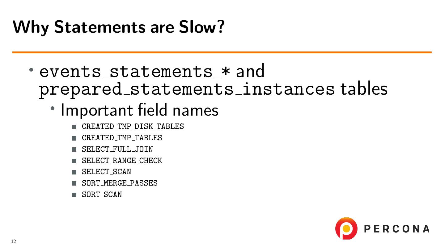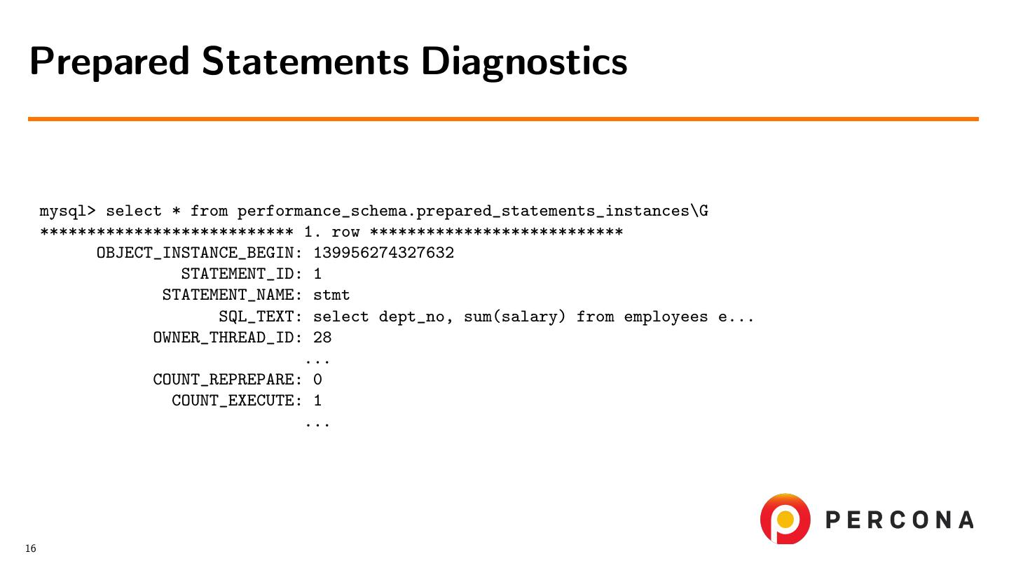 22 .Prepared Statements Diagnostics ... SUM_ROWS_SENT: 9 SUM_ROWS_EXAMINED: 2011495 SUM_CREATED_TMP_DISK_TABLES: 0 SUM_CREATED_TMP_TABLES: 1 ... SUM_SELECT_SCAN: 1 ... SUM_SORT_ROWS: 9 SUM_SORT_SCAN: 1 17