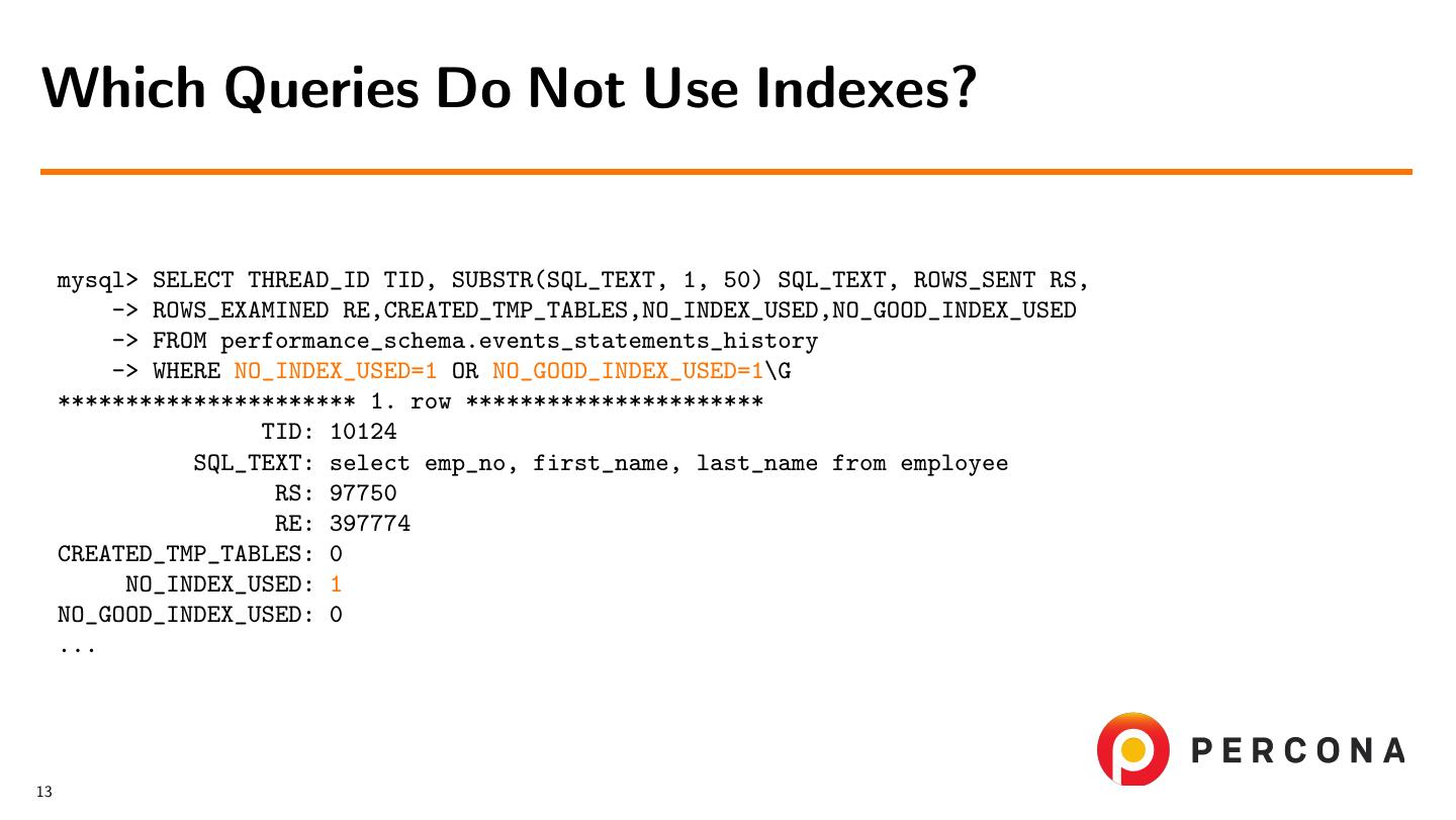 18 .Which Queries Do Not Use Indexes? mysql> SELECT THREAD_ID TID, SUBSTR(SQL_TEXT, 1, 50) SQL_TEXT, ROWS_SENT RS, -> ROWS_EXAMINED RE,CREATED_TMP_TABLES,NO_INDEX_USED,NO_GOOD_INDEX_USED -> FROM performance_schema.events_statements_history -> WHERE NO_INDEX_USED=1 OR NO_GOOD_INDEX_USED=1\G ********************** 1. row ********************** TID: 10124 SQL_TEXT: select emp_no, first_name, last_name from employee RS: 97750 RE: 397774 CREATED_TMP_TABLES: 0 NO_INDEX_USED: 1 NO_GOOD_INDEX_USED: 0 ... 13
