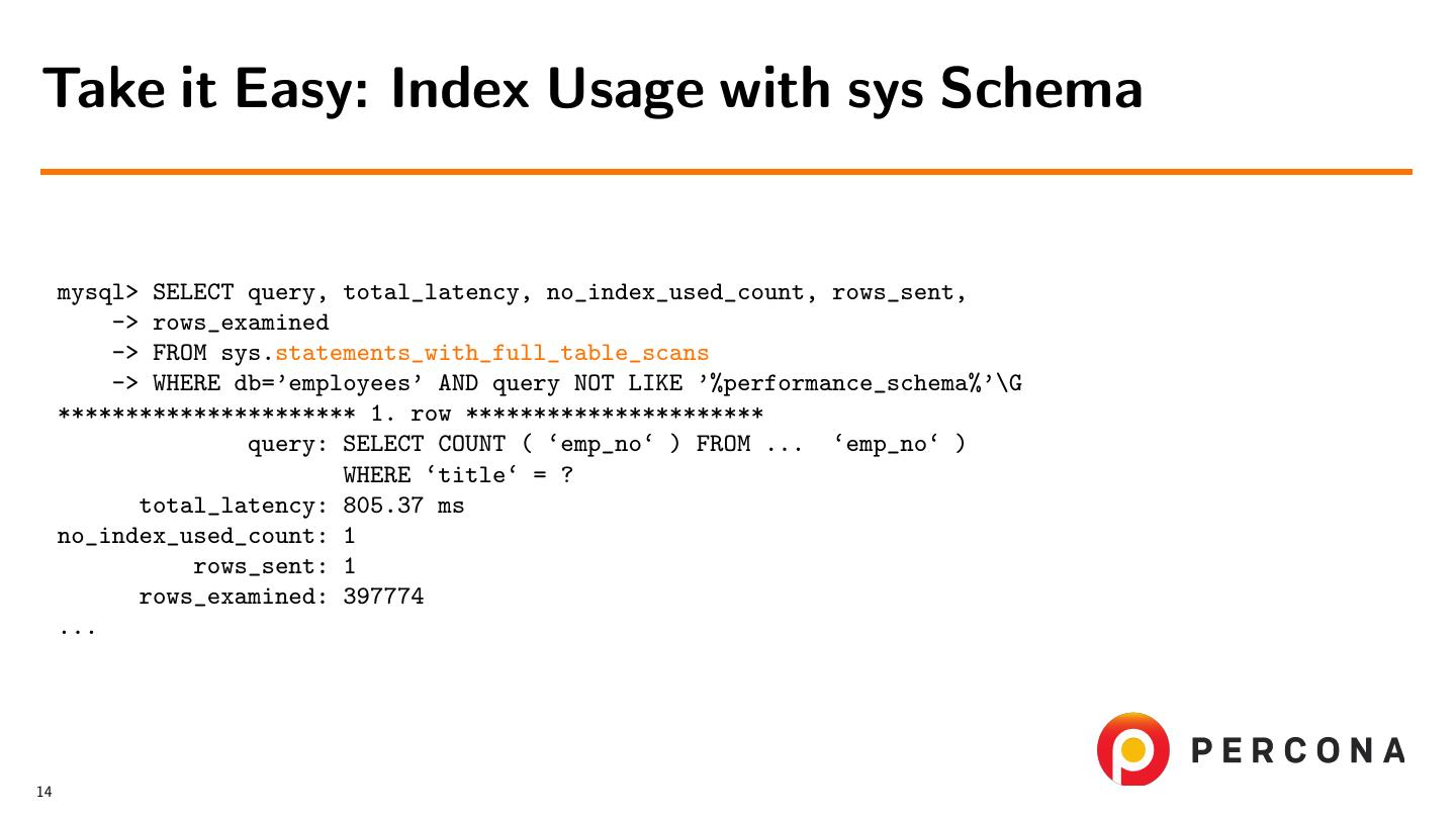 19 .Take it Easy: Index Usage with sys Schema mysql> SELECT query, total_latency, no_index_used_count, rows_sent, -> rows_examined -> FROM sys.statements_with_full_table_scans -> WHERE db=’employees’ AND query NOT LIKE ’%performance_schema%’\G ********************** 1. row ********************** query: SELECT COUNT ( ‘emp_no‘ ) FROM ... ‘emp_no‘ ) WHERE ‘title‘ = ? total_latency: 805.37 ms no_index_used_count: 1 rows_sent: 1 rows_examined: 397774 ... 14