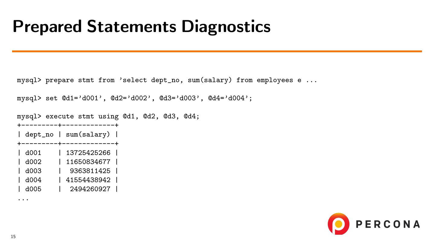 20 .Prepared Statements Diagnostics mysql> prepare stmt from ’select dept_no, sum(salary) from employees e ... mysql> set @d1=’d001’, @d2=’d002’, @d3=’d003’, @d4=’d004’; mysql> execute stmt using @d1, @d2, @d3, @d4; +---------+-------------+ | dept_no | sum(salary) | +---------+-------------+ | d001 | 13725425266 | | d002 | 11650834677 | | d003 | 9363811425 | | d004 | 41554438942 | | d005 | 2494260927 | ... 15