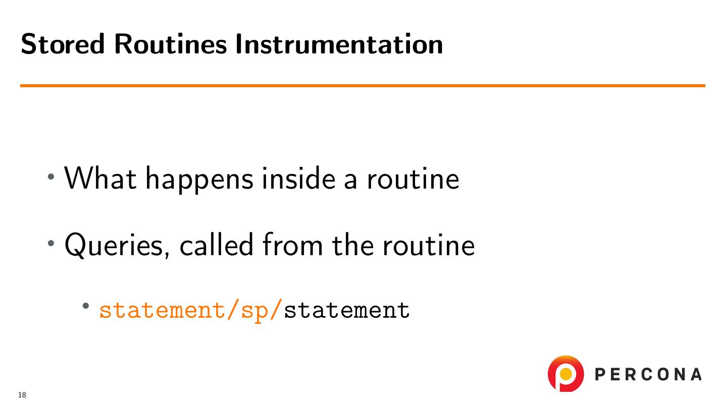 23 .Stored Routines Instrumentation • What happens inside a routine • Queries, called from the routine • statement/sp/statement 18