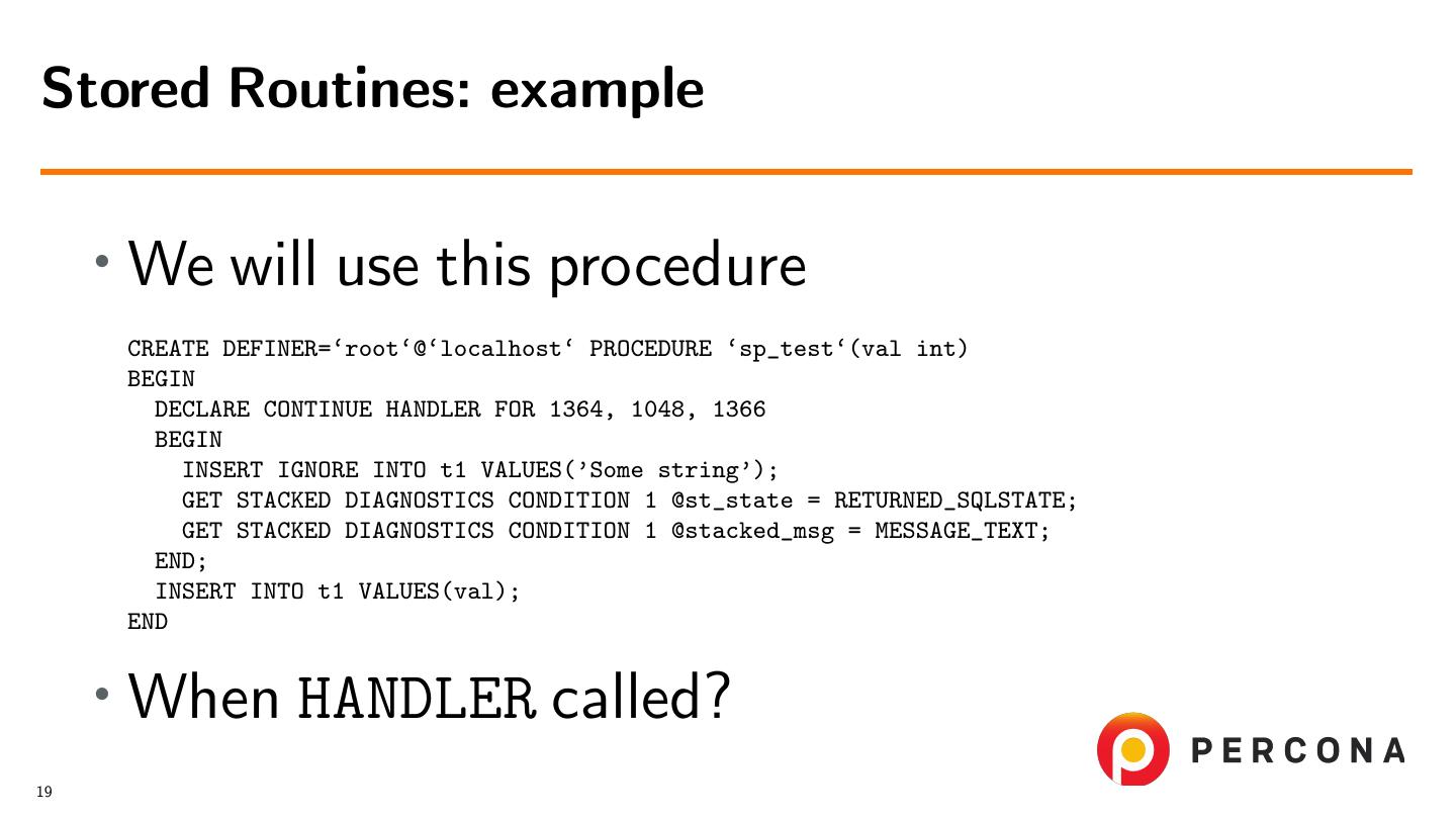 24 .Stored Routines: example • We will use this procedure CREATE DEFINER=‘root‘@‘localhost‘ PROCEDURE ‘sp_test‘(val int) BEGIN DECLARE CONTINUE HANDLER FOR 1364, 1048, 1366 BEGIN INSERT IGNORE INTO t1 VALUES(’Some string’); GET STACKED DIAGNOSTICS CONDITION 1 @st_state = RETURNED_SQLSTATE; GET STACKED DIAGNOSTICS CONDITION 1 @stacked_msg = MESSAGE_TEXT; END; INSERT INTO t1 VALUES(val); END • When HANDLER called? 19