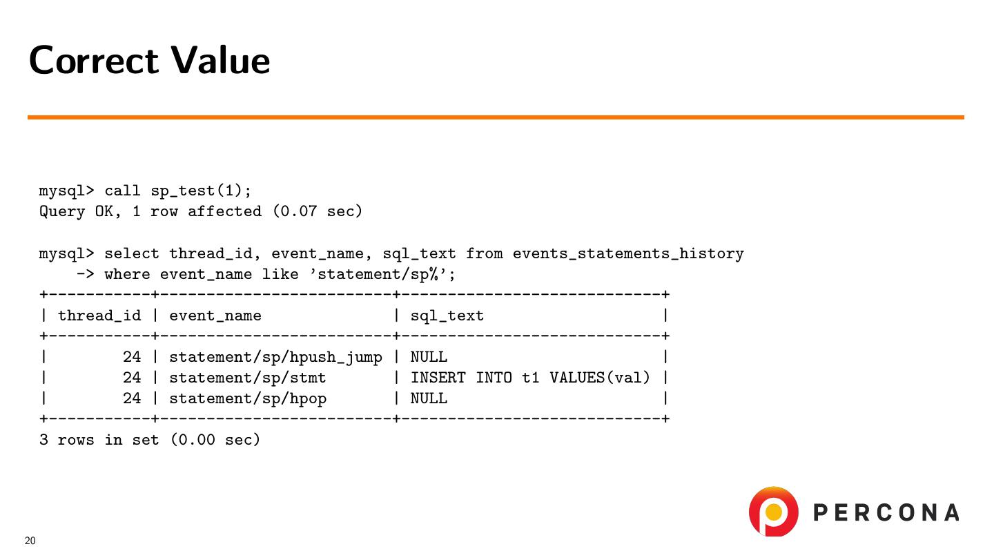 25 .Correct Value mysql> call sp_test(1); Query OK, 1 row affected (0.07 sec) mysql> select thread_id, event_name, sql_text from events_statements_history -> where event_name like ’statement/sp%’; +-----------+-------------------------+----------------------------+ | thread_id | event_name | sql_text | +-----------+-------------------------+----------------------------+ | 24 | statement/sp/hpush_jump | NULL | | 24 | statement/sp/stmt | INSERT INTO t1 VALUES(val) | | 24 | statement/sp/hpop | NULL | +-----------+-------------------------+----------------------------+ 3 rows in set (0.00 sec) 20