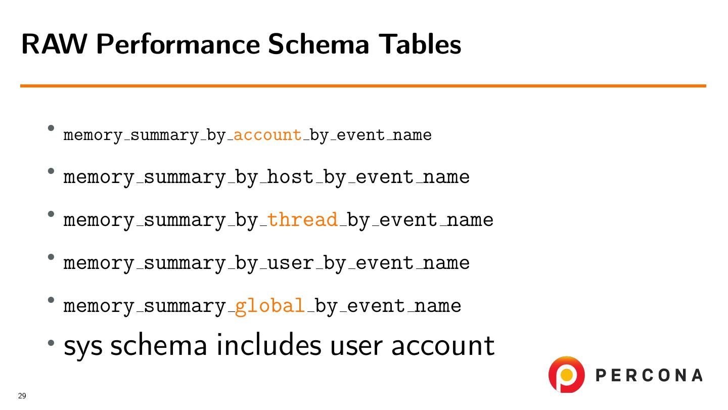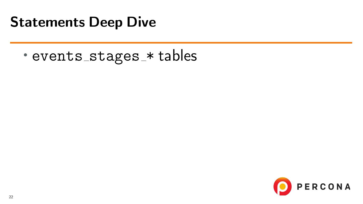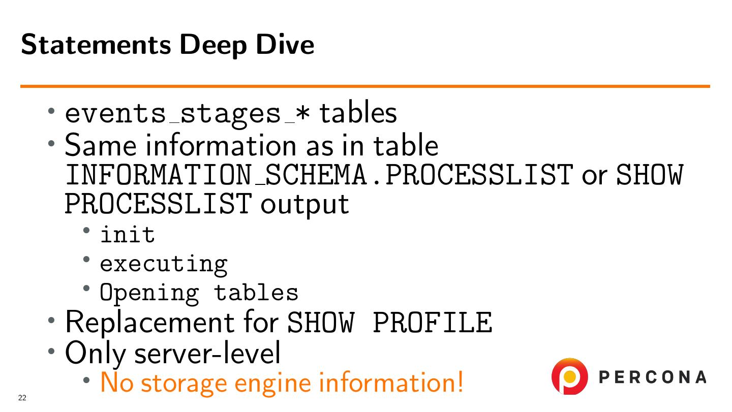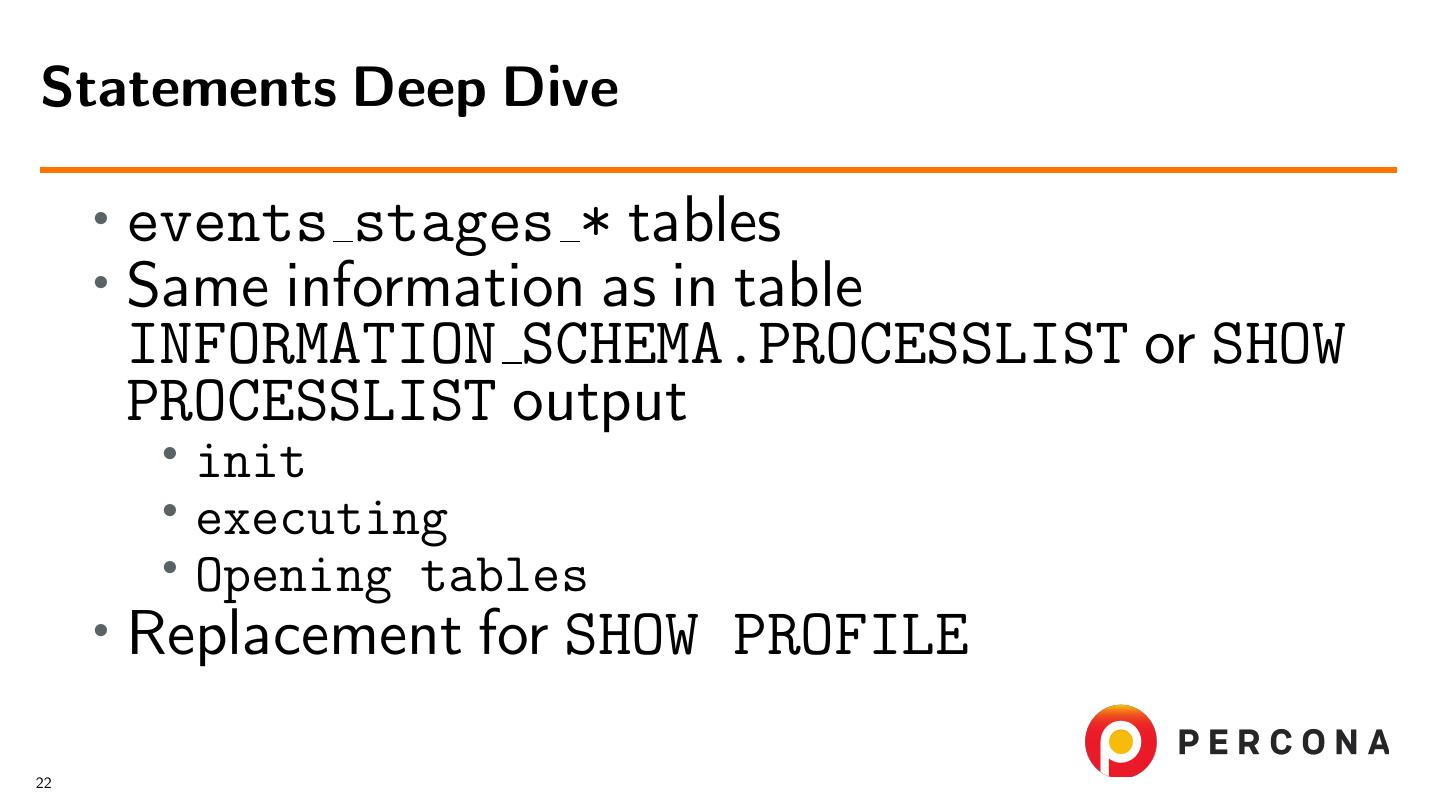 28 .Statements Deep Dive • events stages * tables • Same information as in table INFORMATION SCHEMA.PROCESSLIST or SHOW PROCESSLIST output • init • executing • Opening tables 22