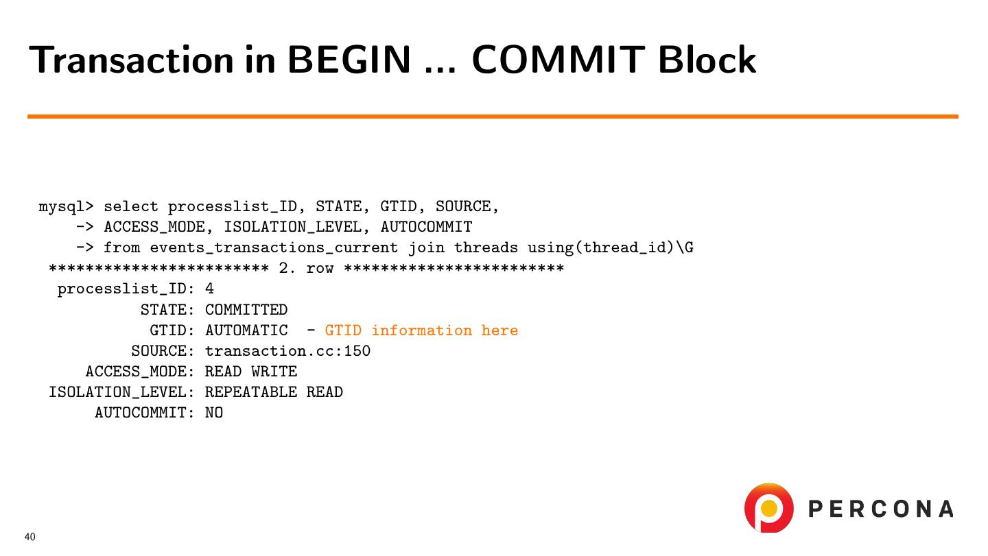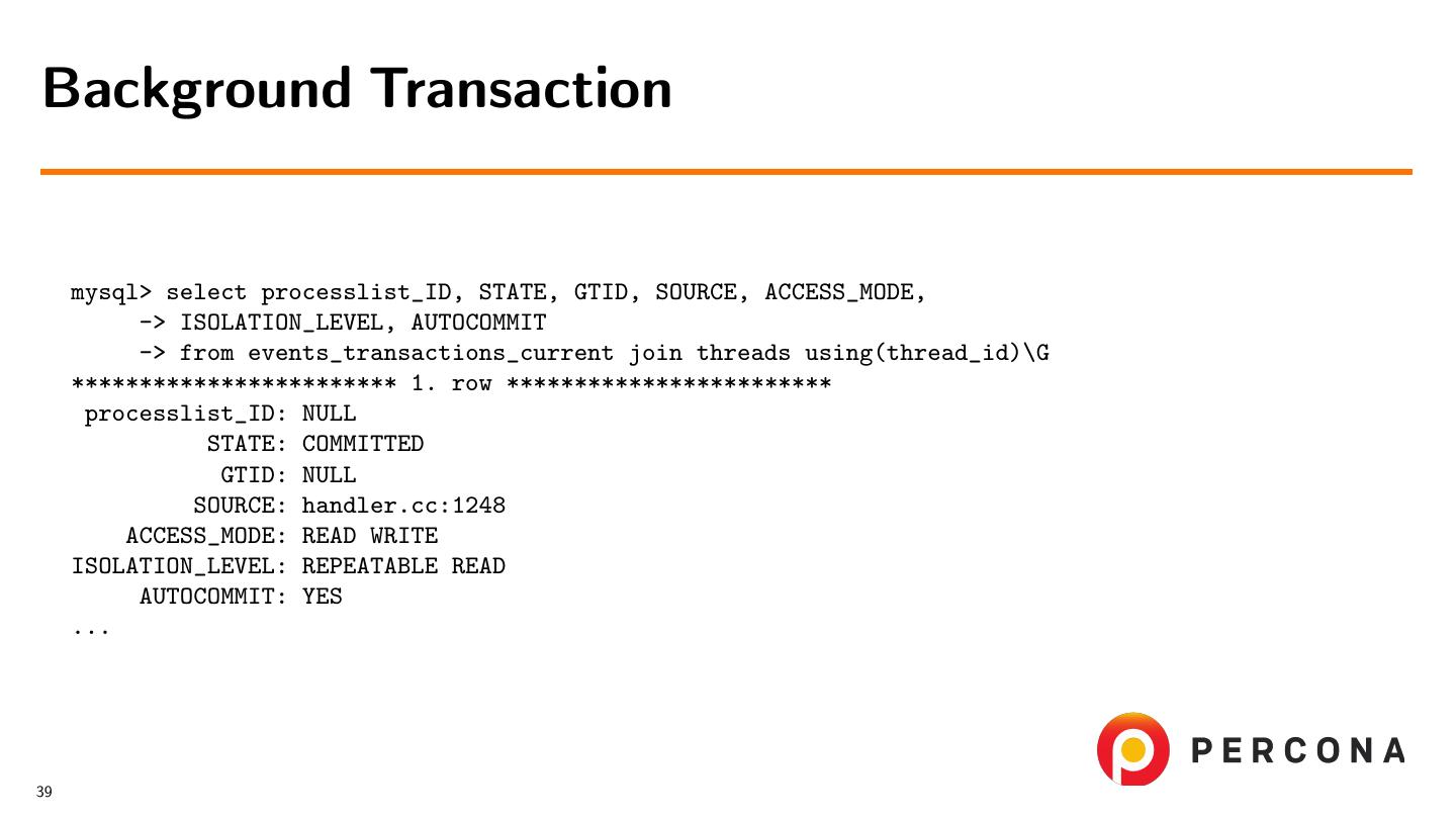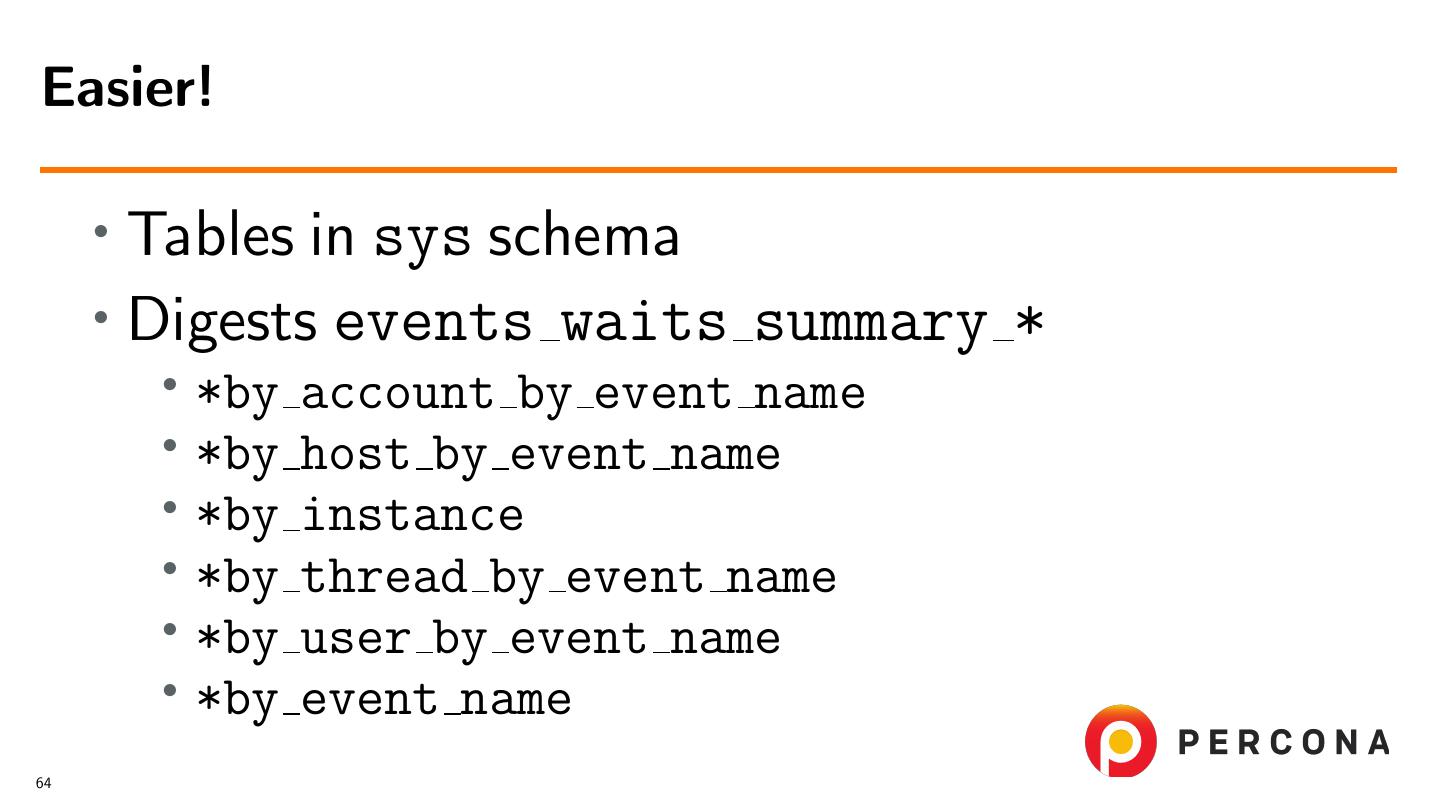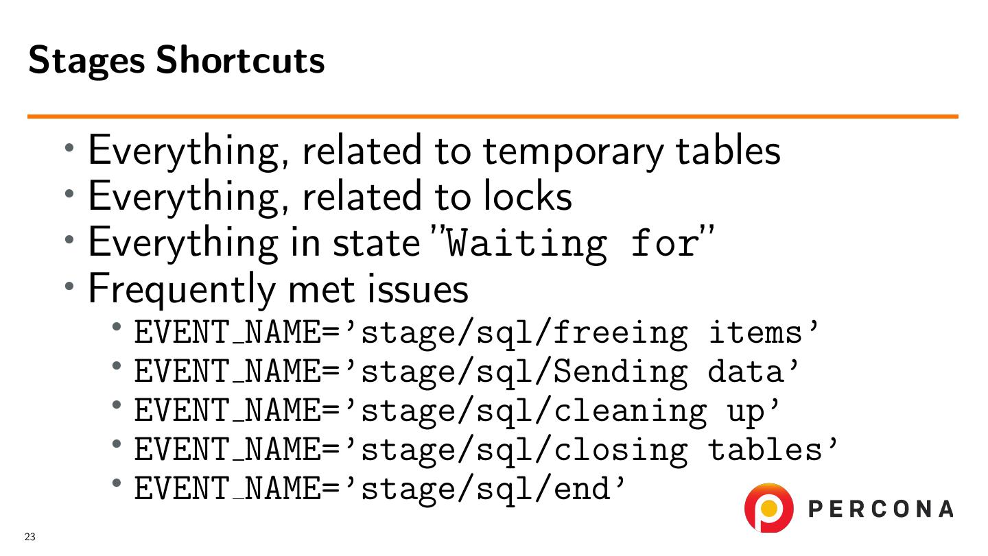 29 .Statements Deep Dive • events stages * tables • Same information as in table INFORMATION SCHEMA.PROCESSLIST or SHOW PROCESSLIST output • init • executing • Opening tables • Replacement for SHOW PROFILE 22