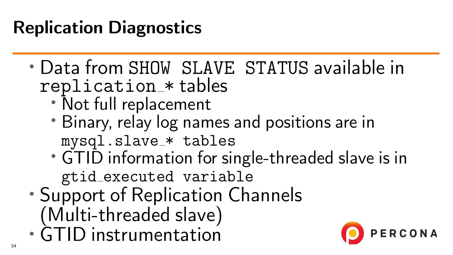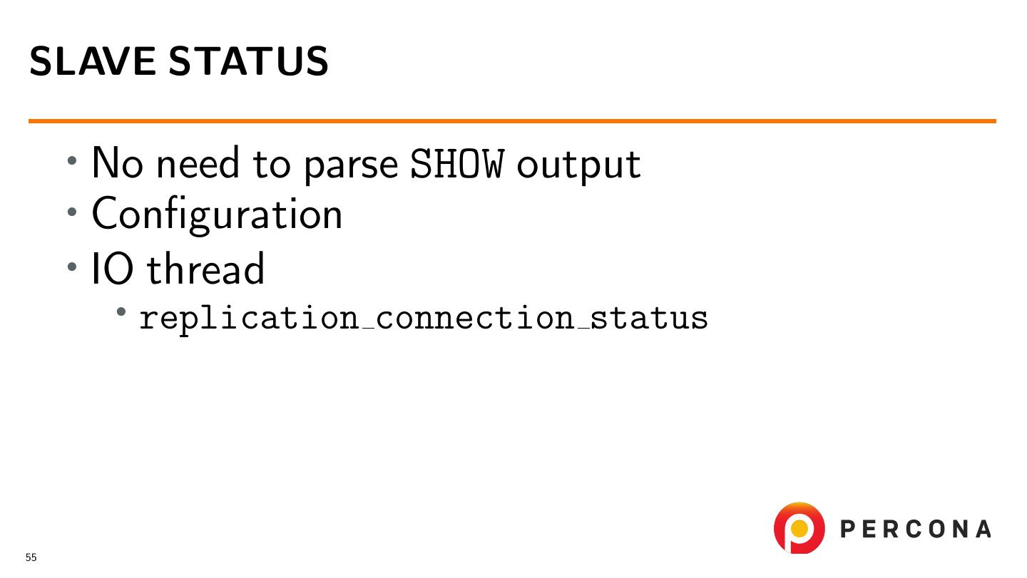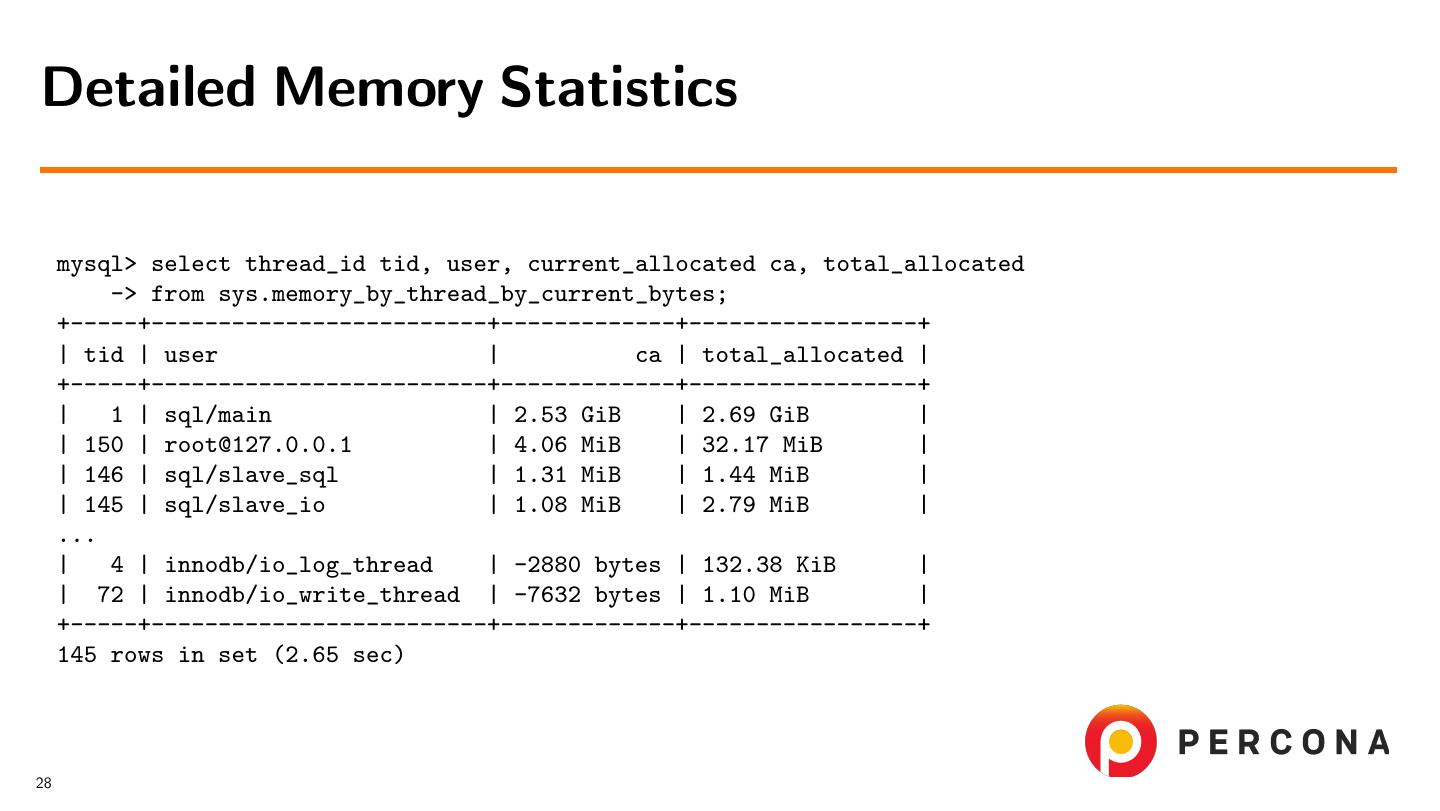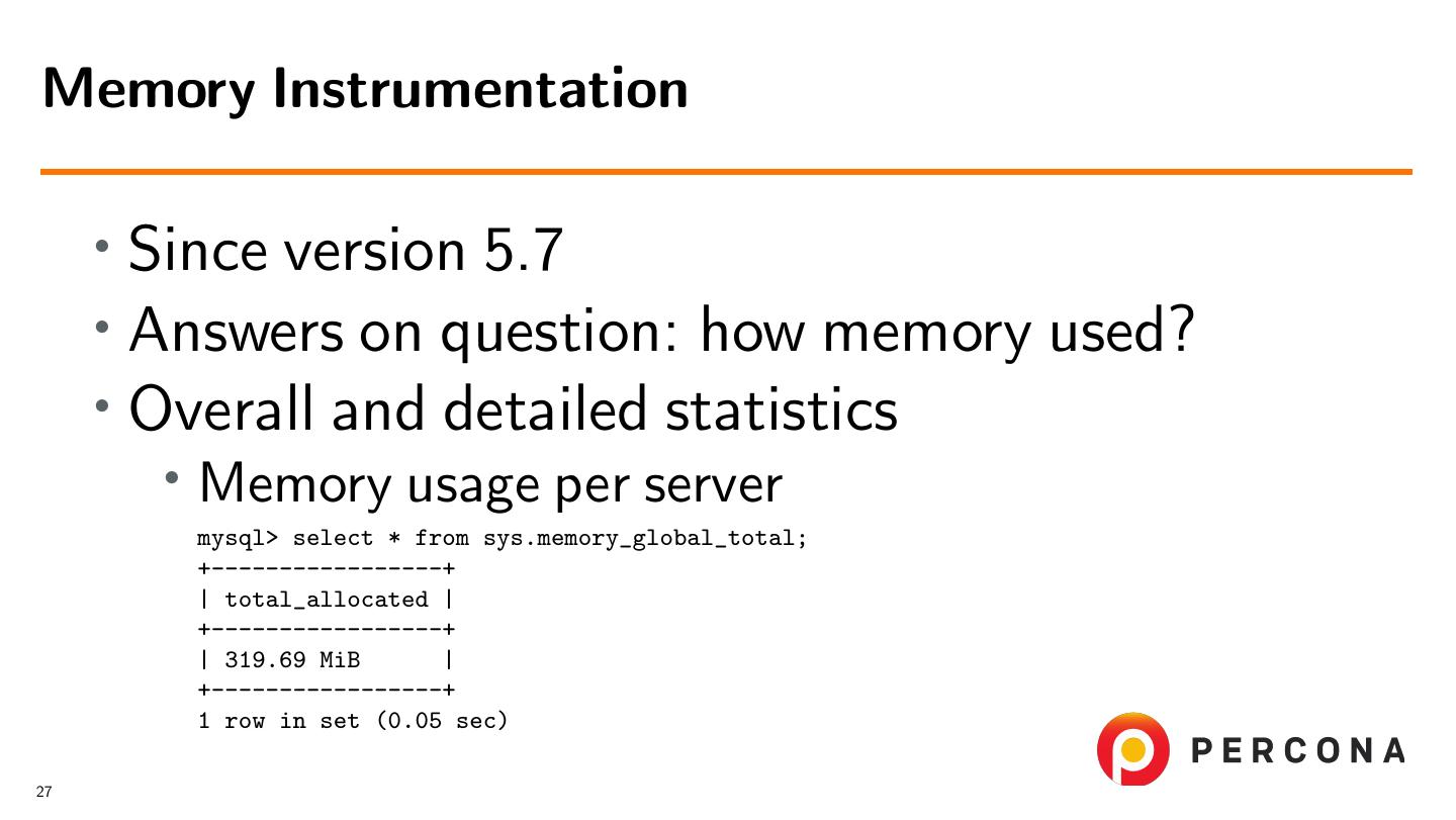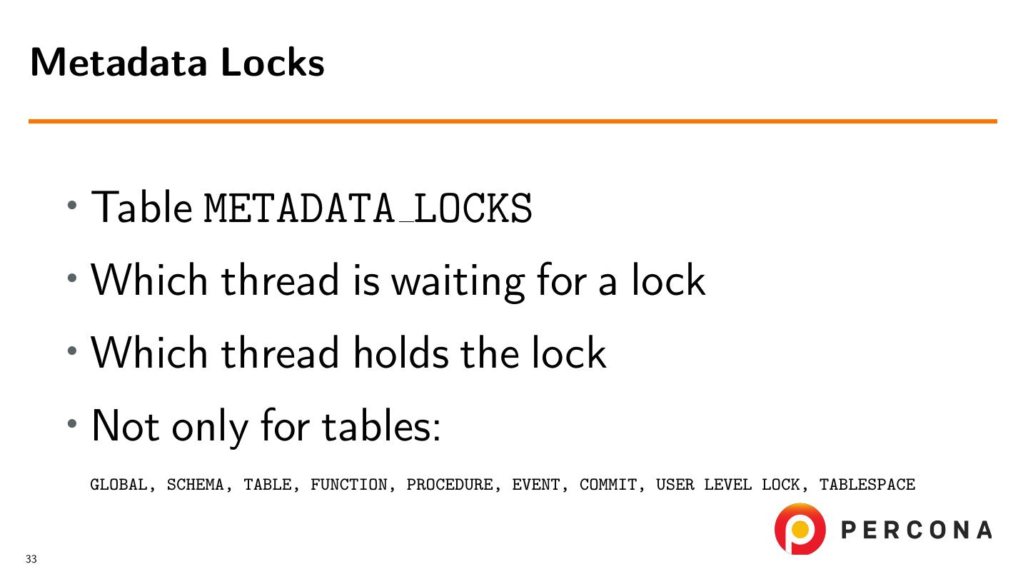 2 .Table of Contents •Overview and Configuration •Statements •Memory Usage •Locks Diagnostics •Variables and Status •Errors Summary •Connection Diagnostics •Replication •Server Internals 2