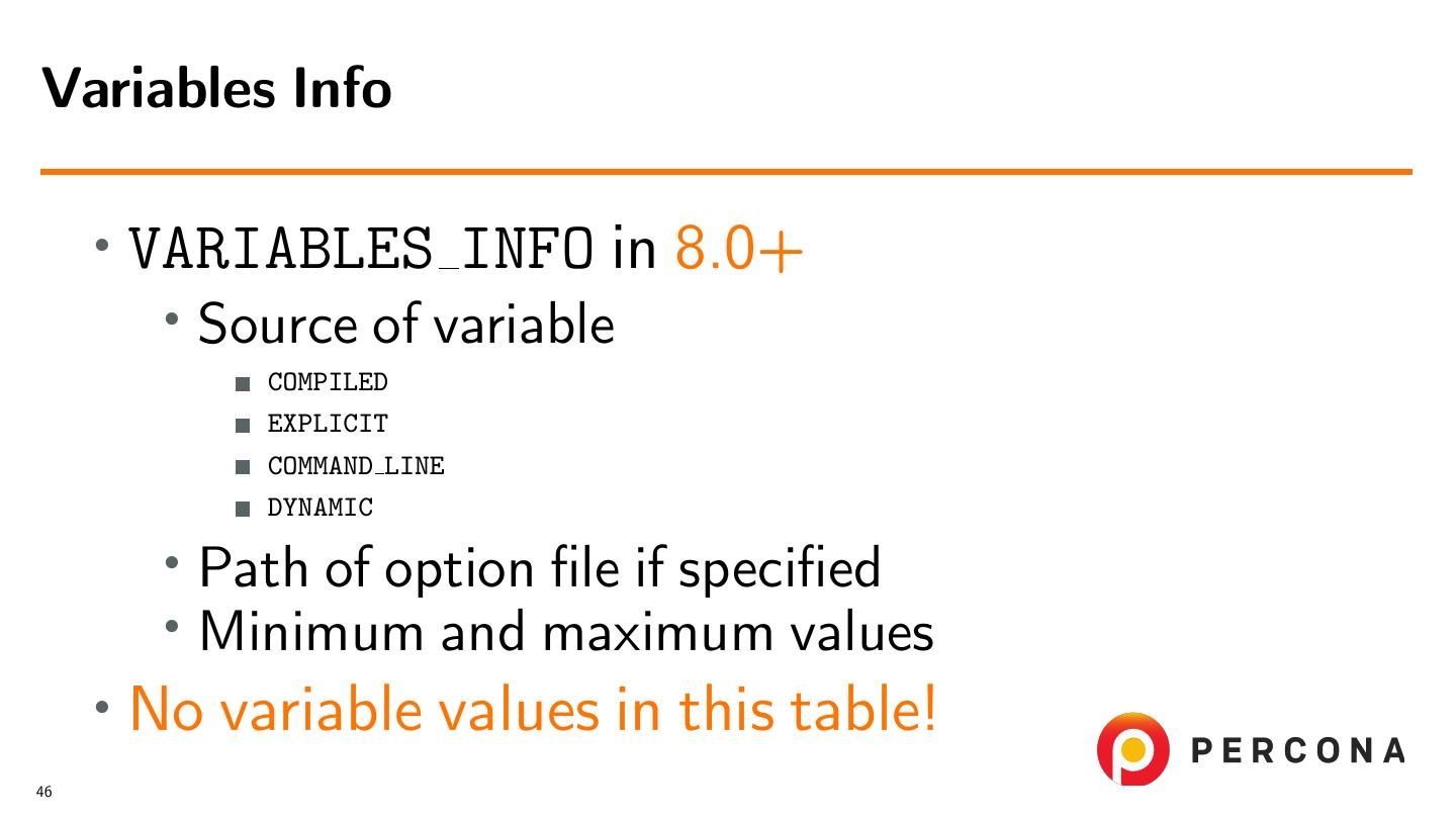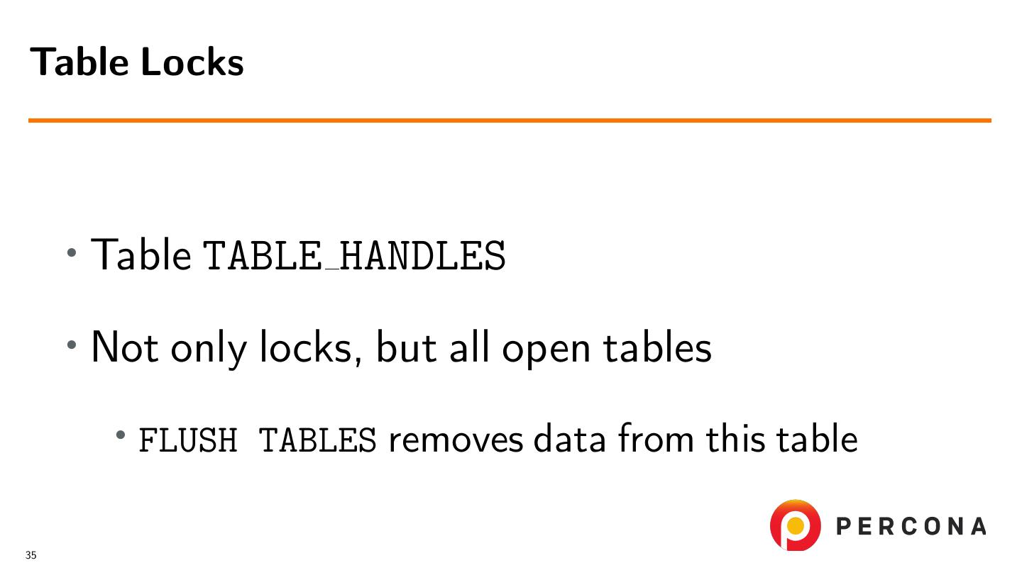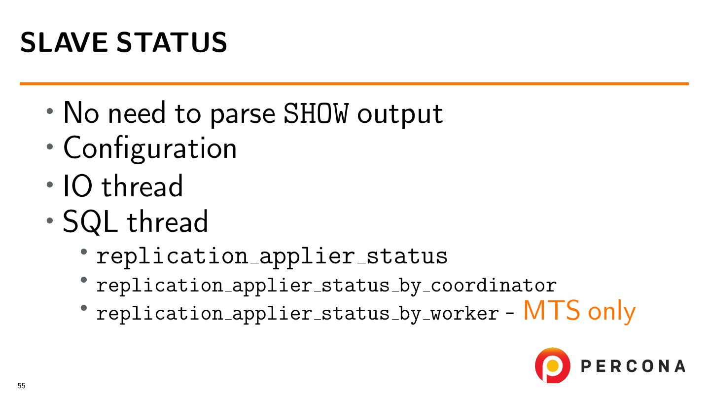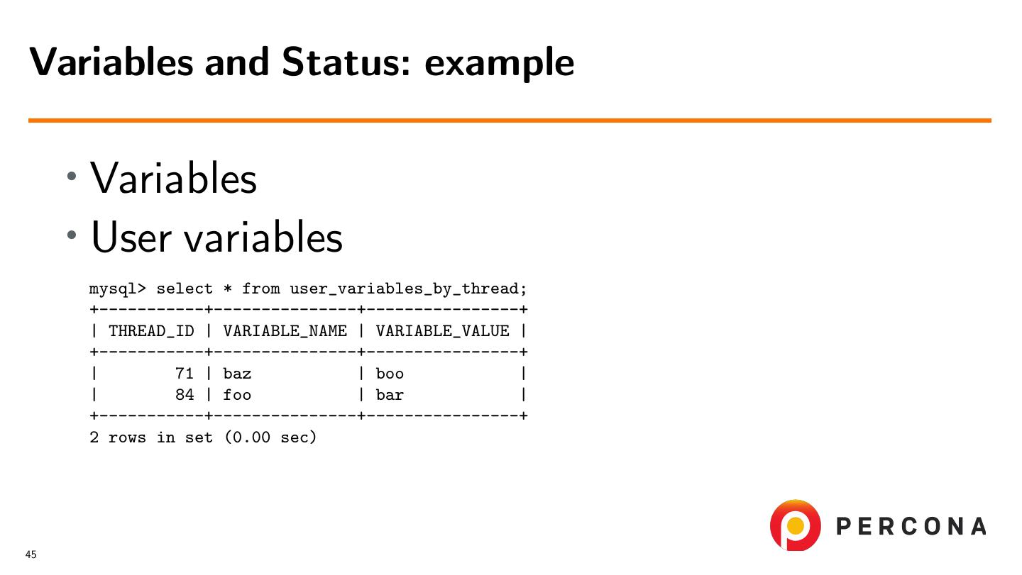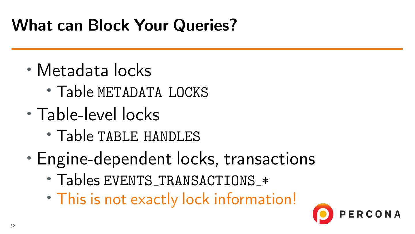 2 .Table of Contents •Overview and Configuration •Statements •Memory Usage •Locks Diagnostics •Variables and Status •Errors Summary •Connection Diagnostics •Replication •Server Internals 2
