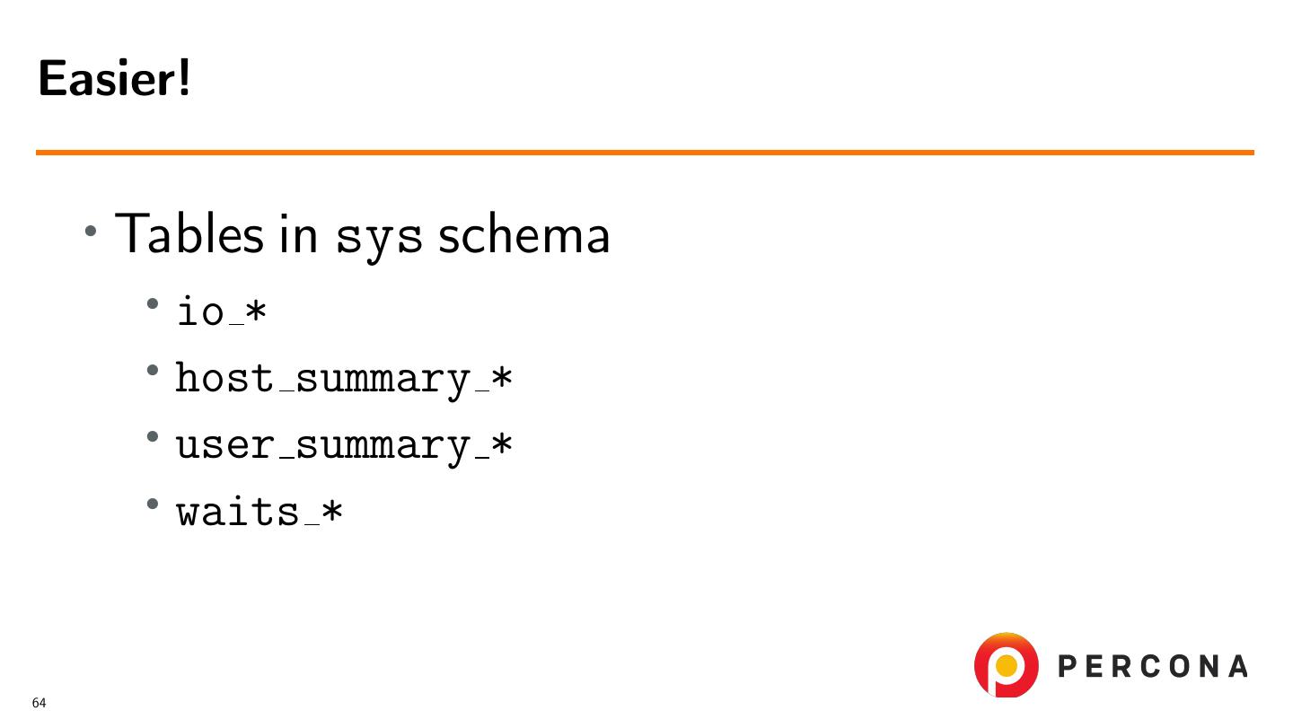 17 .Why Statements are Slow? • events statements * and prepared statements instances tables • Views in sys schema • Important view names statement analysis statements with full table scans statements with runtimes in 95th percentile statements with sorting statements with temp tables statements with errors or warnings 12