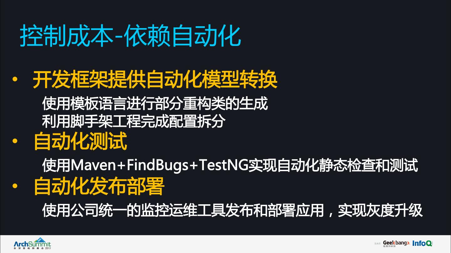 29 .控制成本-依赖自动化 • 开发框架提供自动化模型转换 使用模板语言进行部分重构类的生成 利用脚手架工程完成配置拆分 • 自动化测试 使用Maven+FindBugs+TestNG实现自动化静态检查和测试 • 自动化发布部署 使用公司统一的监控运维工具发布和部署应用,实现灰度升级