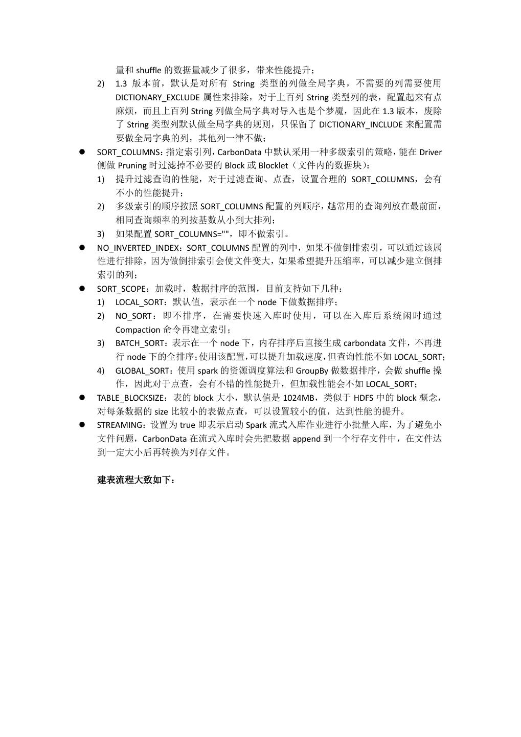 2 . 量和 shuffle 的数据量减少了很多,带来性能提升; 2) 1.3 版本前,默认是对所有 String 类型的列做全局字典,不需要的列需要使用 DICTIONARY_EXCLUDE 属性来排除,对于上百列 String 类型列的表,配置起来有点 麻烦,而且上百列 String 列做全局字典对导入也是个梦魇,因此在 1.3 版本,废除 了 String 类型列默认做全局字典的规则,只保留了 DICTIONARY_INCLUDE 来配置需 要做全局字典的列,其他列一律不做; SORT_COLUMNS:指定索引列,CarbonData 中默认采用一种多级索引的策略,能在 Driver 侧做 Pruning 时过滤掉不必要的 Block 或 Blocklet(文件内的数据块) : 1) 提升过滤查询的性能,对于过滤查询、点查,设置合理的 SORT_COLUMNS,会有 不小的性能提升; 2) 多级索引的顺序按照 SORT_COLUMNS 配置的列顺序,越常用的查询列放在最前面, 相同查询频率的列按基数从小到大排列; 3) 如果配置 SORT_COLUMNS="",即不做索引。 NO_INVERTED_INDEX:SORT_COLUMNS 配置的列中,如果不做倒排索引,可以通过该属 性进行排除,因为做倒排索引会使文件变大,如果希望提升压缩率,可以减少建立倒排 索引的列; SORT_SCOPE:加载时,数据排序的范围,目前支持如下几种: 1) LOCAL_SORT:默认值,表示在一个 node 下做数据排序; 2) NO_SORT:即不排序,在需要快速入库时使用,可以在入库后系统闲时通过 Compaction 命令再建立索引; 3) BATCH_SORT:表示在一个 node 下,内存排序后直接生成 carbondata 文件,不再进 行 node 下的全排序; 使用该配置,可以提升加载速度,但查询性能不如 LOCAL_SORT; 4) GLOBAL_SORT:使用 spark 的资源调度算法和 GroupBy 做数据排序,会做 shuffle 操 作,因此对于点查,会有不错的性能提升,但加载性能会不如 LOCAL_SORT; TABLE_BLOCKSIZE:表的 block 大小,默认值是 1024MB,类似于 HDFS 中的 block 概念, 对每条数据的 size 比较小的表做点查,可以设置较小的值,达到性能的提升。 STREAMING:设置为 true 即表示启动 Spark 流式入库作业进行小批量入库,为了避免小 文件问题,CarbonData 在流式入库时会先把数据 append 到一个行存文件中,在文件达 到一定大小后再转换为列存文件。 建表流程大致如下: