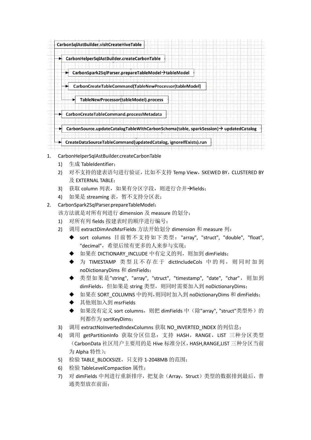 3 .1. CarbonHelperSqlAstBuilder.createCarbonTable 1) 生成 TableIdentifier; 2) 对不支持的建表语句进行验证,比如不支持 Temp View,SKEWED BY,CLUSTERED BY 及 EXTERNAL TABLE; 3) 获取 column 列表,如果有分区字段,则进行合并fields; 4) 如果是 streaming 表,暂不支持分区表; 2. CarbonSpark2SqlParser.prepareTableModel: 该方法就是对所有列进行 dimension 及 measure 的划分; 1) 对所有列 fields 按建表时的顺序进行编号; 2) 调用 extractDimAndMsrFields 方法开始划分 dimension 和 measure 列: sort columns 目 前 暂 不 支 持 如 下 类 型 : "array", "struct", "double", "float", "decimal",希望后续有更多的人来参与实现; 如果在 DICTIONARY_INCLUDE 中有定义的列,则加到 dimFields; 为 TIMESTAMP 类 型 且 不 存 在 于 dictIncludeCols 中 的 列 , 则 同 时 加 到 noDictionaryDims 和 dimFields; 类型如果是"string", "array", "struct", "timestamp", "date", "char",则加到 dimFields,但如果是 string 类型,则同时需要加入到 noDictionaryDims; 如果在 SORT_COLUMNS 中的列, 则同时加入到 noDictionaryDims 和 dimFields; 其他则加入到 msrFields 如果没有定义 sort columns,则把 dimFields 中(除"array", "struct"类型外)的 列都作为 sortKeyDims; 3) 调用 extractNoInvertedIndexColumns 获取 NO_INVERTED_INDEX 的列信息; 4) 调用 getPartitionInfo 获取分区信息:支持 HASH,RANGE,LIST 三种分区类型 (CarbonData 社区用户主要用的是 Hive 标准分区,HASH,RANGE,LIST 三种分区当前 为 Alpha 特性) ; 5) 检验 TABLE_BLOCKSIZE,只支持 1-2048MB 的范围; 6) 检验 TableLevelCompaction 属性; 7) 对 dimFields 中列进行重新排序,把复杂(Array,Struct)类型的数据排到最后,普 通类型放在前面;