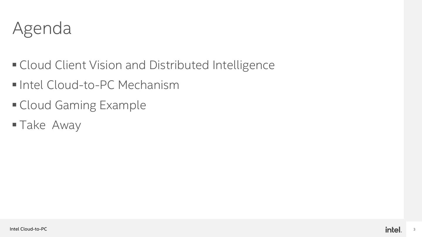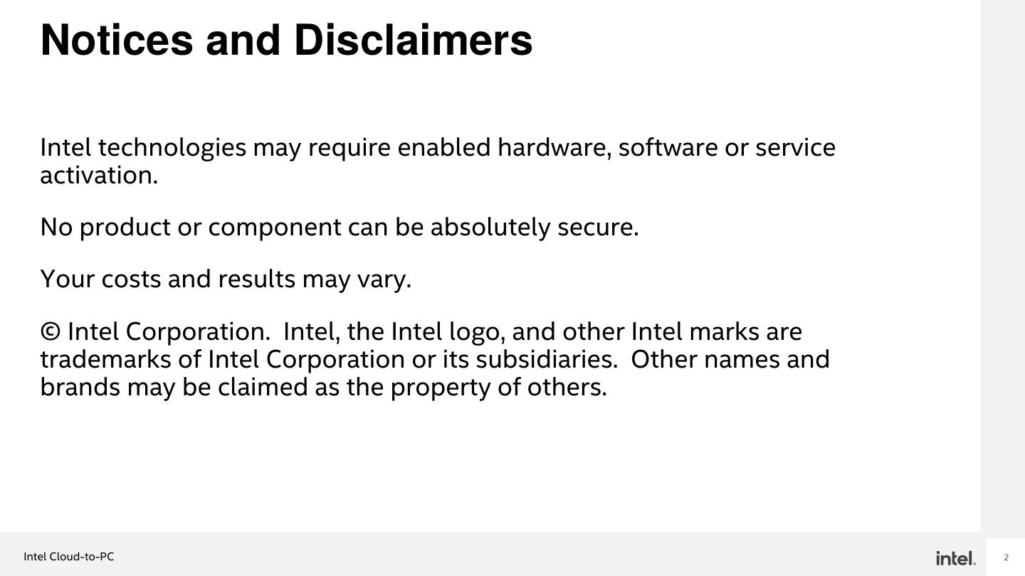 2 . Notices and Disclaimers Intel technologies may require enabled hardware, software or service activation. No product or component can be absolutely secure. Your costs and results may vary. © Intel Corporation. Intel, the Intel logo, and other Intel marks are trademarks of Intel Corporation or its subsidiaries. Other names and brands may be claimed as the property of others. Intel Cloud-to-PC 2
