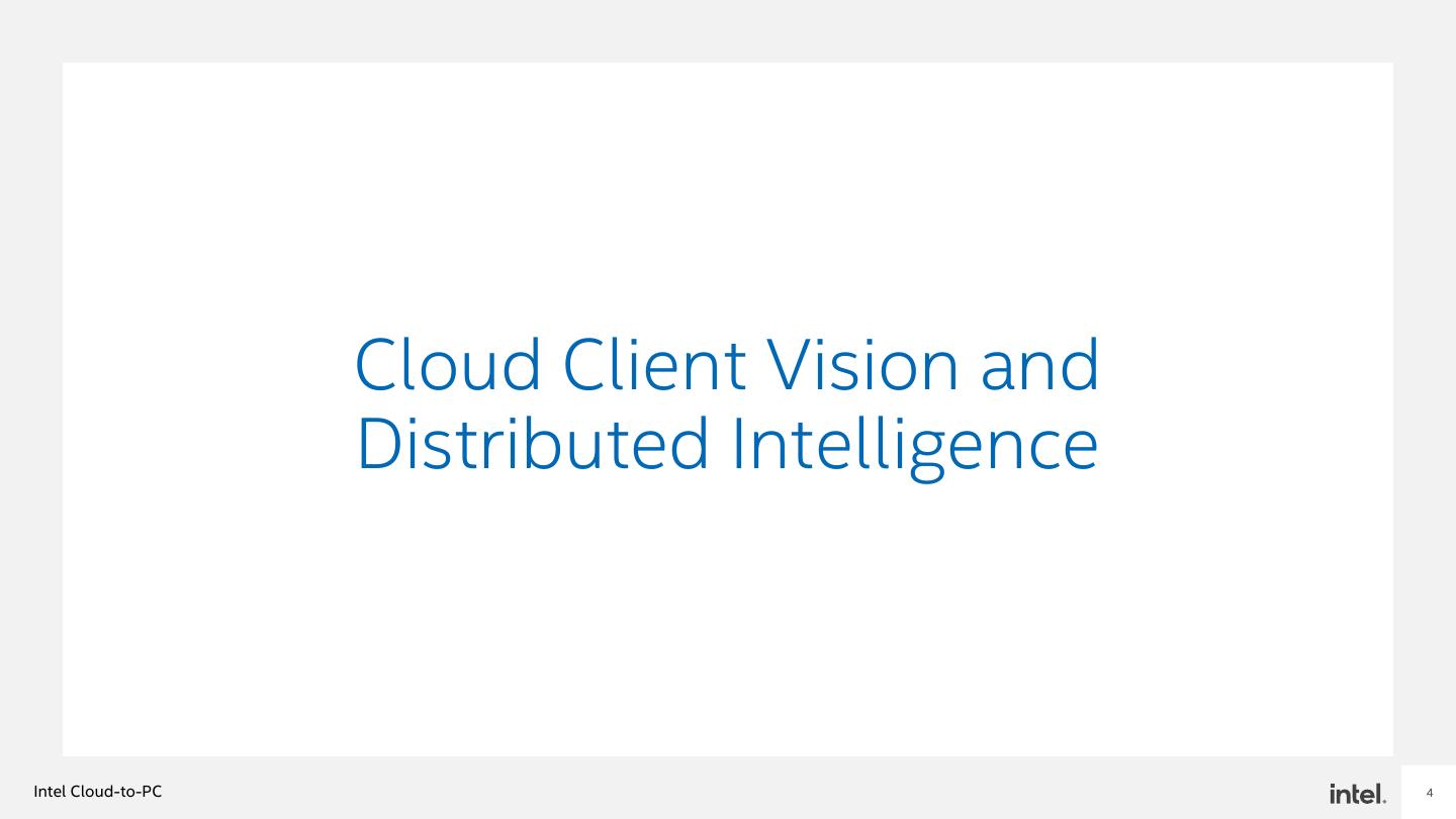 3 . Agenda ▪ Cloud Client Vision and Distributed Intelligence ▪ Intel Cloud-to-PC Mechanism ▪ Cloud Gaming Example ▪ Take Away Intel Cloud-to-PC 3