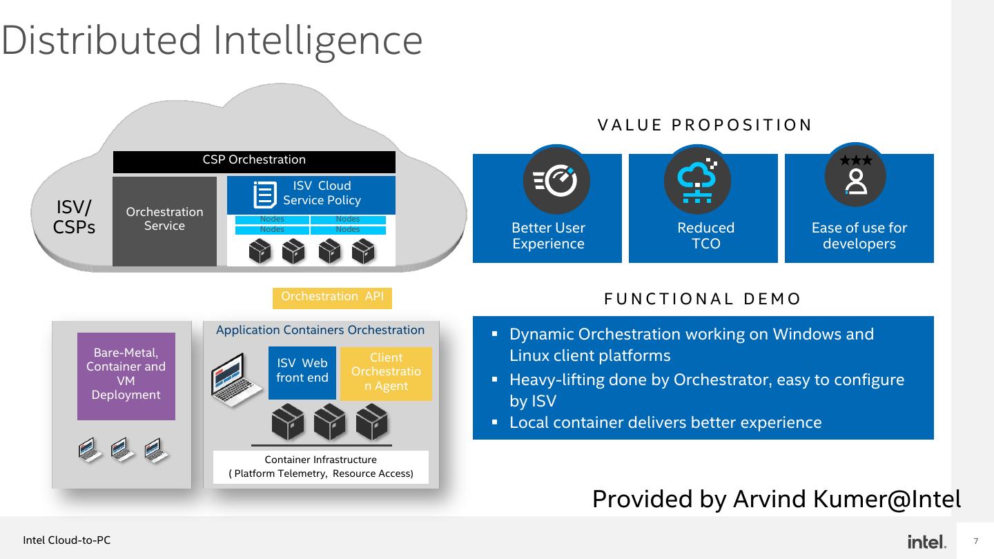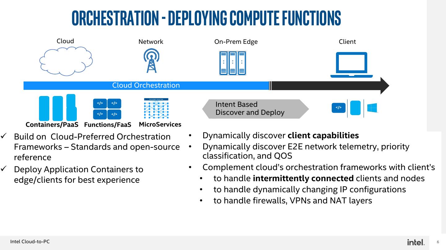 6 . Orchestration - Deploying Compute Functions Cloud Network On-Prem Edge Client Cloud Orchestration </> </> Intent Based </> </> </> Discover and Deploy Containers/PaaS Functions/FaaS MicroServices ✓ Build on Cloud-Preferred Orchestration • Dynamically discover client capabilities Frameworks – Standards and open-source • Dynamically discover E2E network telemetry, priority reference classification, and QOS ✓ Deploy Application Containers to • Complement cloud’s orchestration frameworks with client’s edge/clients for best experience • to handle intermittently connected clients and nodes • to handle dynamically changing IP configurations • to handle firewalls, VPNs and NAT layers Intel Cloud-to-PC 6