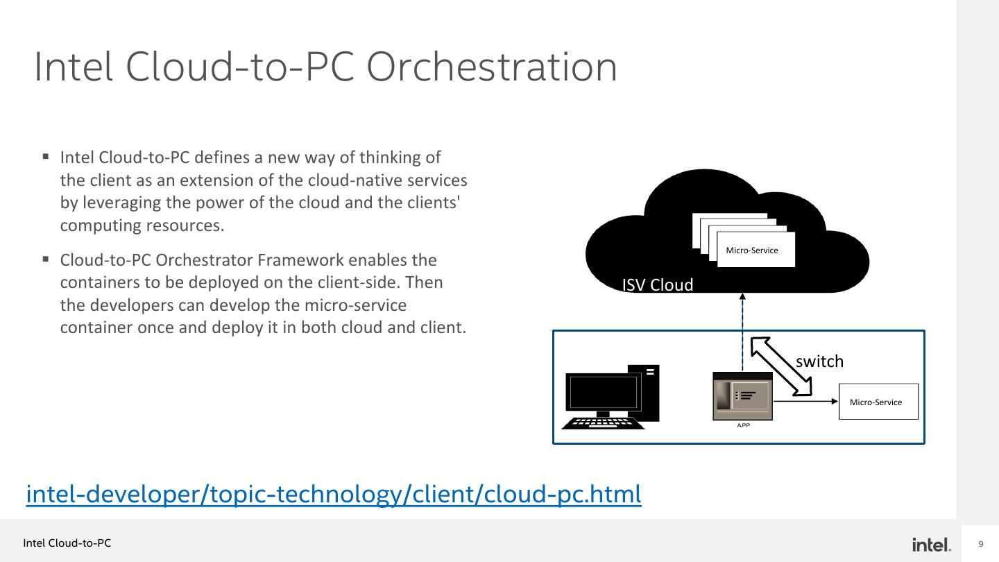 9 . Intel Cloud-to-PC Orchestration ▪ Intel Cloud-to-PC defines a new way of thinking of the client as an extension of the cloud-native services by leveraging the power of the cloud and the clients' computing resources. Micro-Service ▪ Cloud-to-PC Orchestrator Framework enables the containers to be deployed on the client-side. Then ISV Cloud the developers can develop the micro-service container once and deploy it in both cloud and client. switch Micro-Service intel-developer/topic-technology/client/cloud-pc.html Intel Cloud-to-PC 9