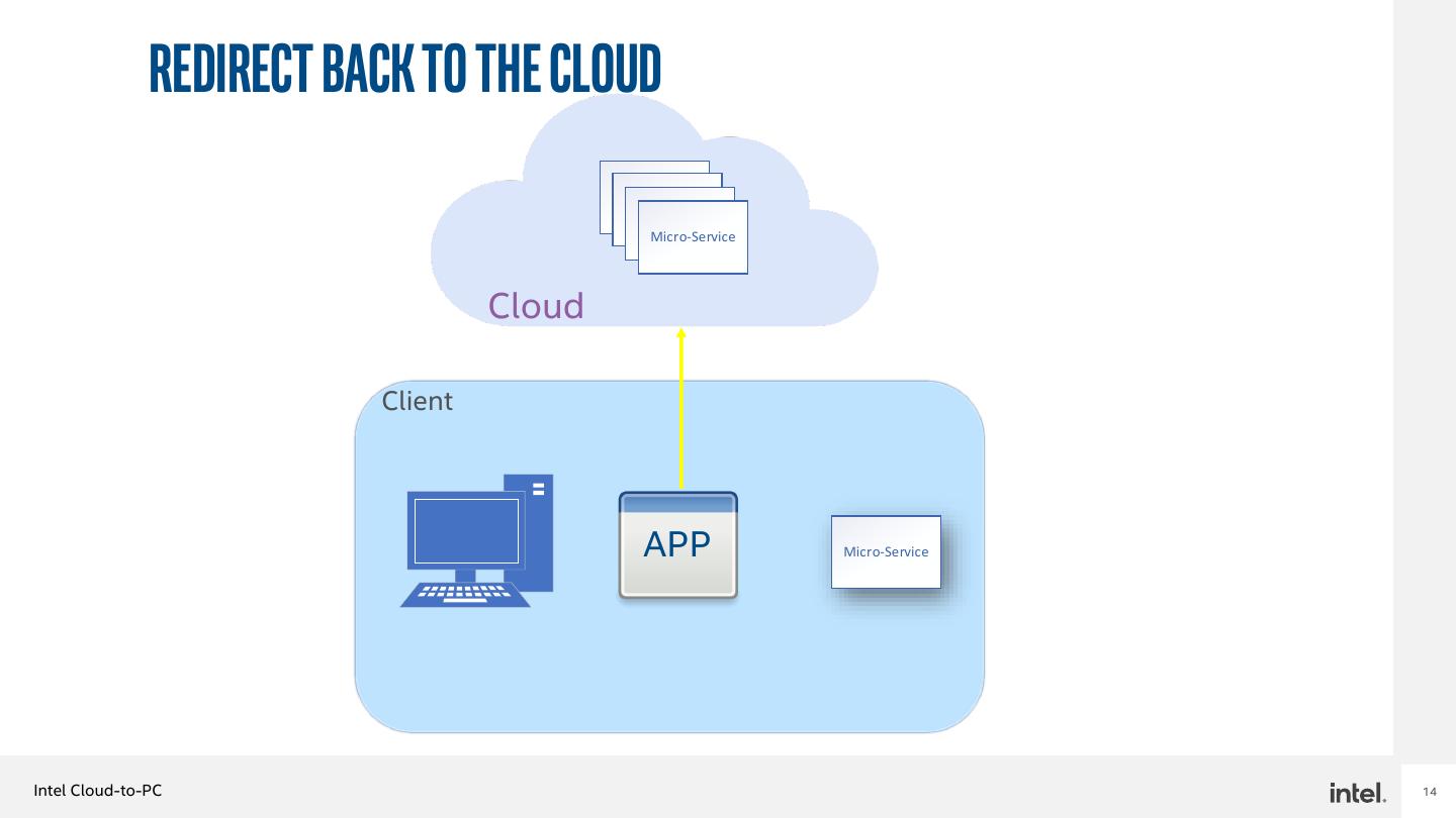13 . Redirect back to the cloud Micro-Service Micro-Service Micro-Service Micro-Service Cloud Client APP Micro-Service Intel Cloud-to-PC 13