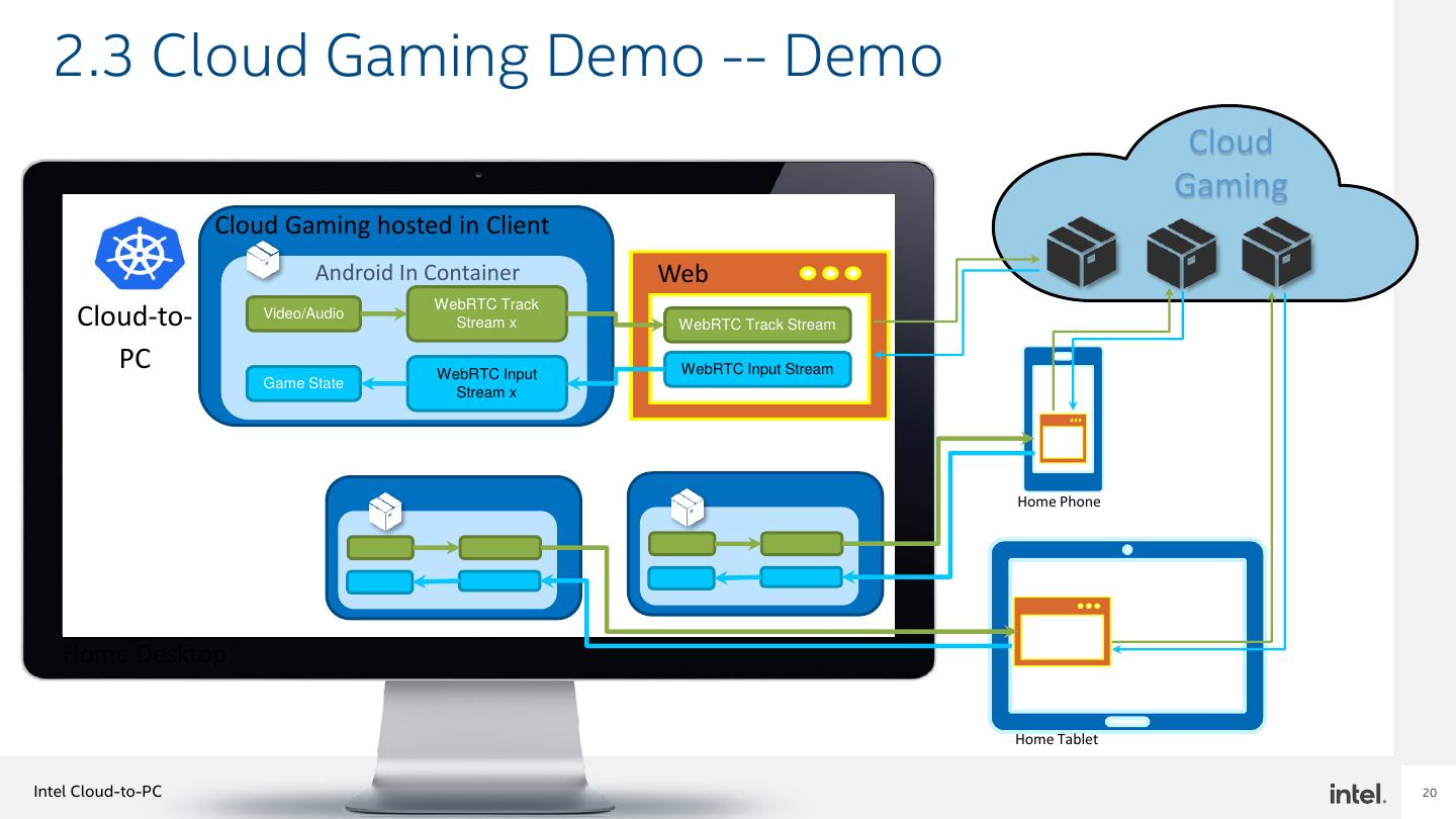 20 . 2.3 Cloud Gaming Demo -- Demo Cloud Gaming Cloud Gaming hosted in Client Android In Container Web WebRTC Track Cloud-to- Video/Audio Video/Audio Stream x WebRTC Track Stream PC WebRTC Input WebRTC Input Stream Game State Game State Stream x Home Phone Home Desktop Home Tablet Intel Cloud-to-PC 20