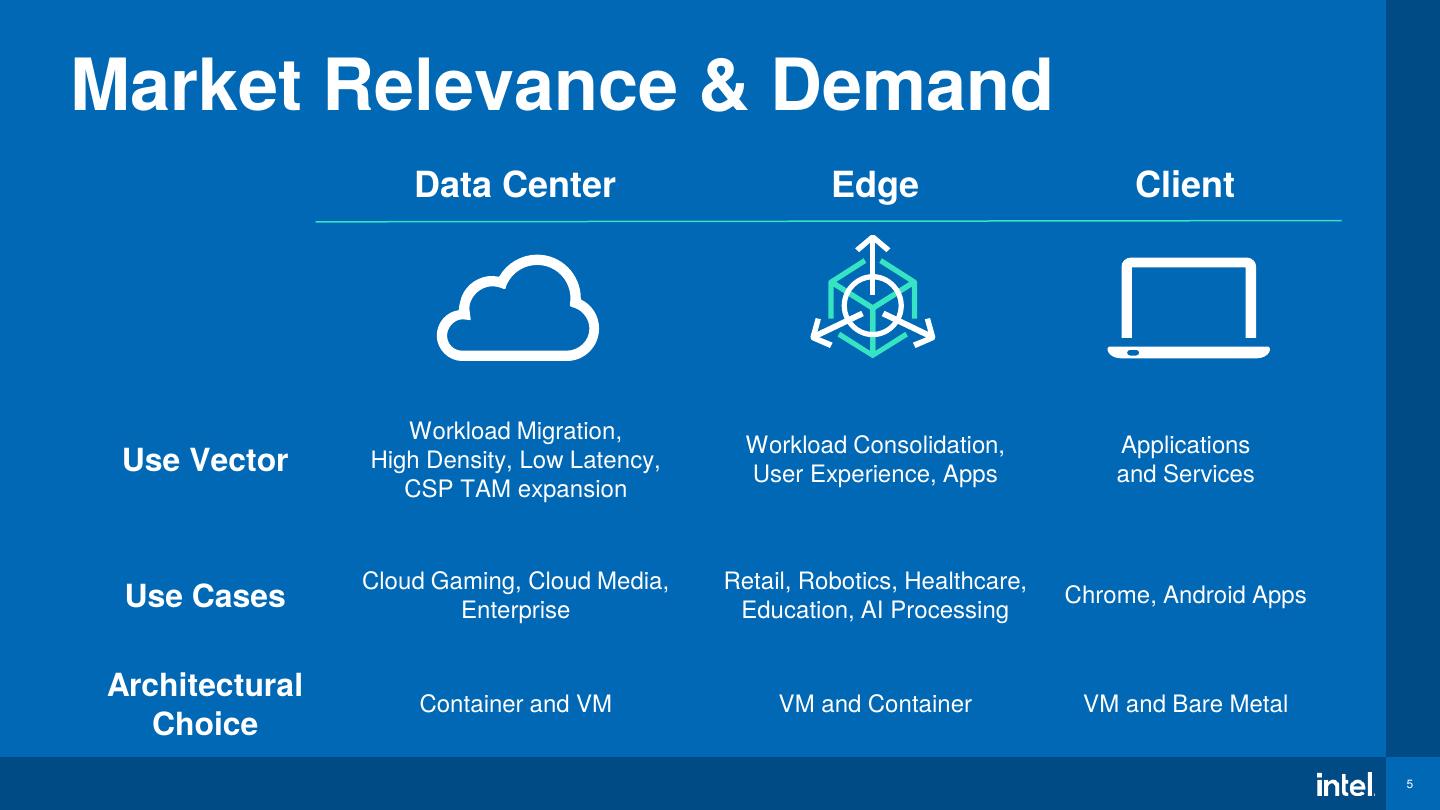 5 .Market Relevance & Demand Data Center Edge Client Workload Migration, Workload Consolidation, Applications Use Vector High Density, Low Latency, User Experience, Apps and Services CSP TAM expansion Cloud Gaming, Cloud Media, Retail, Robotics, Healthcare, Use Cases Enterprise Education, AI Processing Chrome, Android Apps Architectural Container and VM VM and Container VM and Bare Metal Choice 5