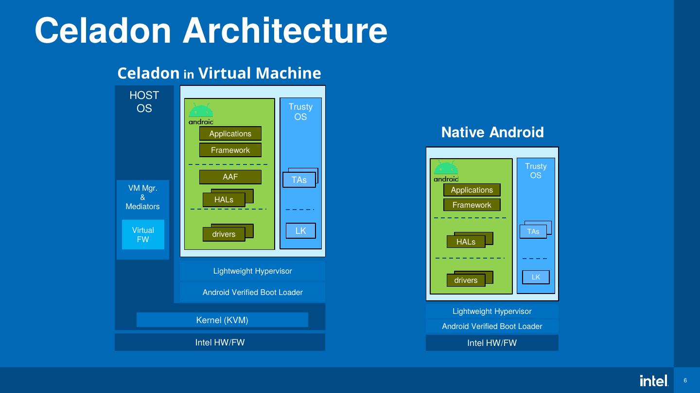 6 .Celadon Architecture Celadon in Virtual Machine HOST OS Trusty OS Applications Native Android Framework Trusty AAF OS TAs VM Mgr. Applications & HALs Mediators Framework Virtual HAL LK TAs drivers FW HALs Lightweight Hypervisor HAL drivers LK Android Verified Boot Loader Lightweight Hypervisor Kernel (KVM) Android Verified Boot Loader Intel HW/FW Intel HW/FW 6