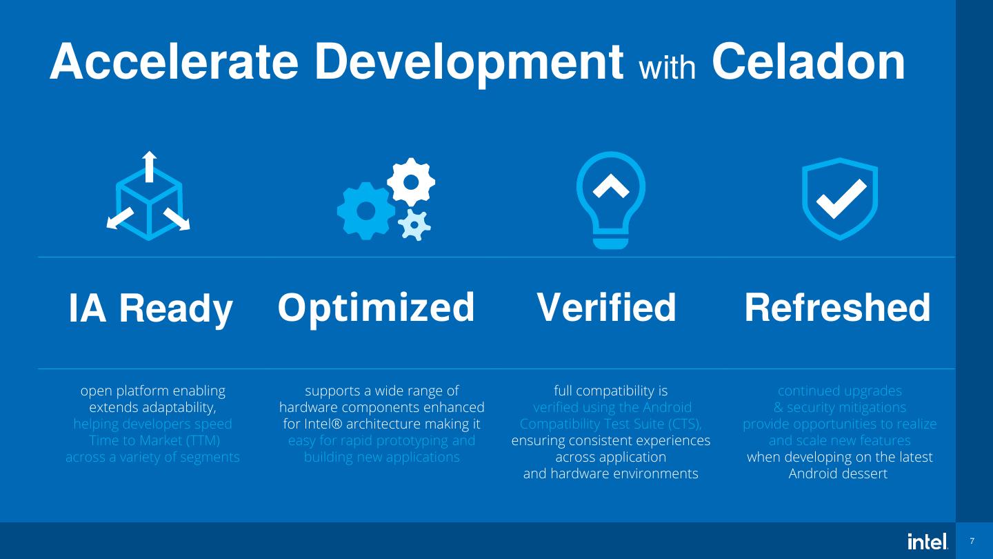 7 .Accelerate Development with Celadon IA Ready Optimized Verified Refreshed open platform enabling supports a wide range of full compatibility is continued upgrades extends adaptability, hardware components enhanced verified using the Android & security mitigations helping developers speed for Intel® architecture making it Compatibility Test Suite (CTS), provide opportunities to realize Time to Market (TTM) easy for rapid prototyping and ensuring consistent experiences and scale new features across a variety of segments building new applications across application when developing on the latest and hardware environments Android dessert 7