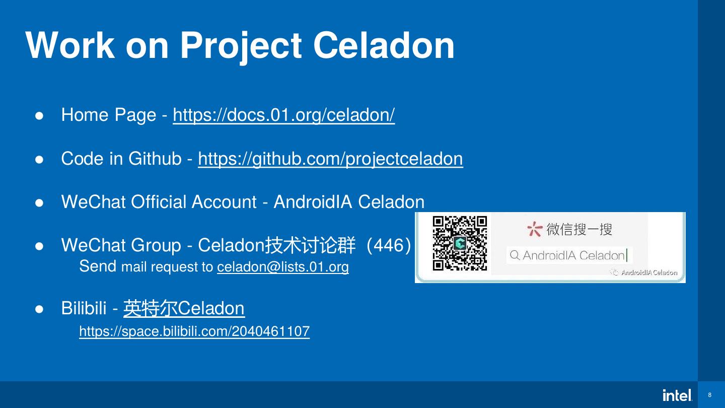 8 .Work on Project Celadon ● Home Page - https://docs.01.org/celadon/ ● Code in Github - https://github.com/projectceladon ● WeChat Official Account - AndroidIA Celadon ● WeChat Group - Celadon技术讨论群(446) Send mail request to celadon@lists.01.org ● Bilibili - 英特尔Celadon https://space.bilibili.com/2040461107 8