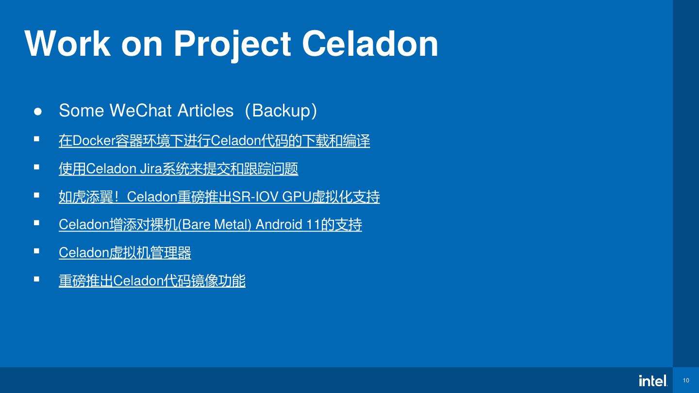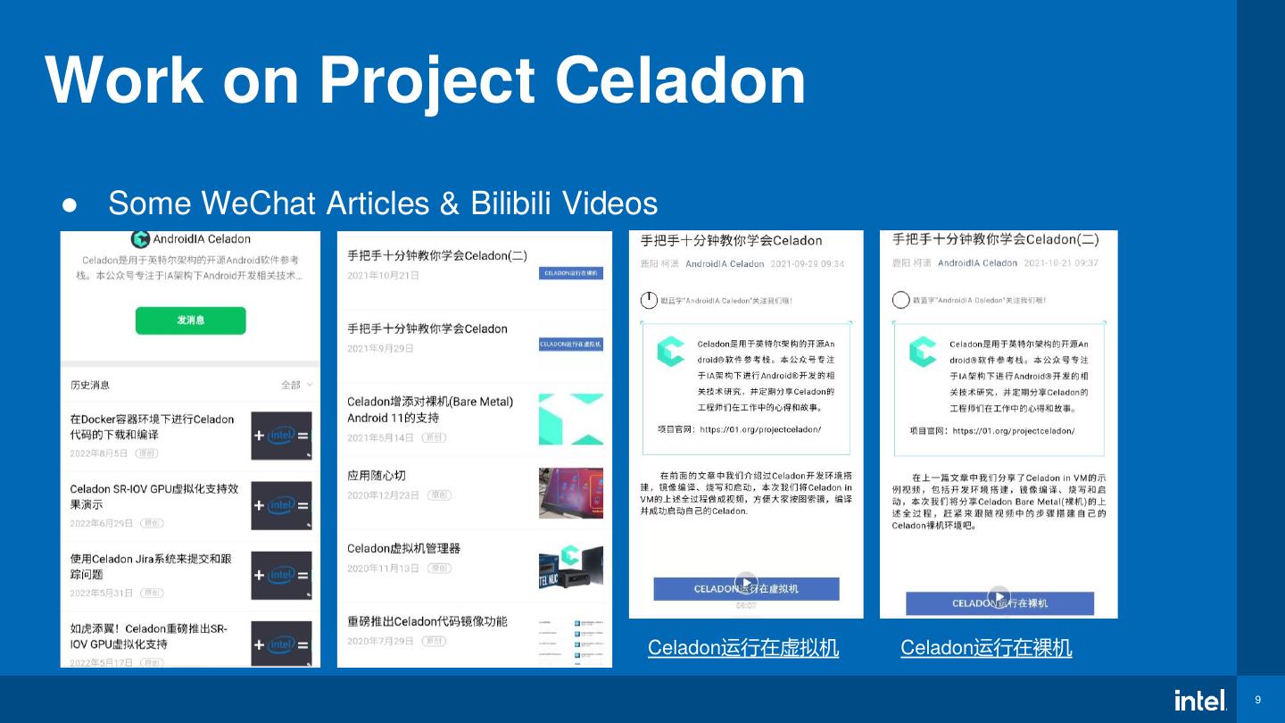 9 .Work on Project Celadon ● Some WeChat Articles & Bilibili Videos Celadon运行在虚拟机 Celadon运行在裸机 9