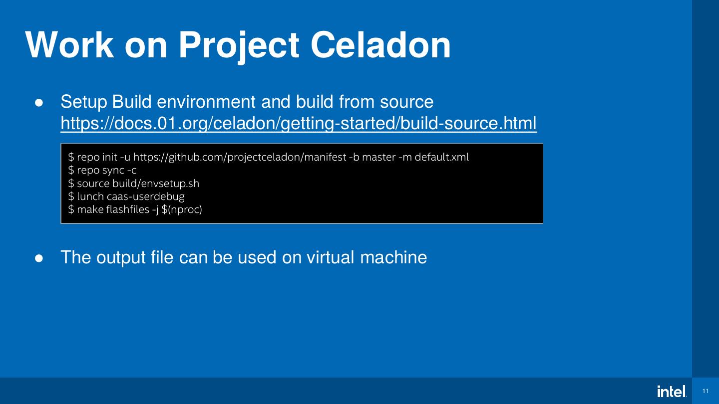 10 .Work on Project Celadon ● Some WeChat Articles(Backup) ▪ 在Docker容器环境下进行Celadon代码的下载和编译 ▪ 使用Celadon Jira系统来提交和跟踪问题 ▪ 如虎添翼!Celadon重磅推出SR-IOV GPU虚拟化支持 ▪ Celadon增添对裸机(Bare Metal) Android 11的支持 ▪ Celadon虚拟机管理器 ▪ 重磅推出Celadon代码镜像功能 10