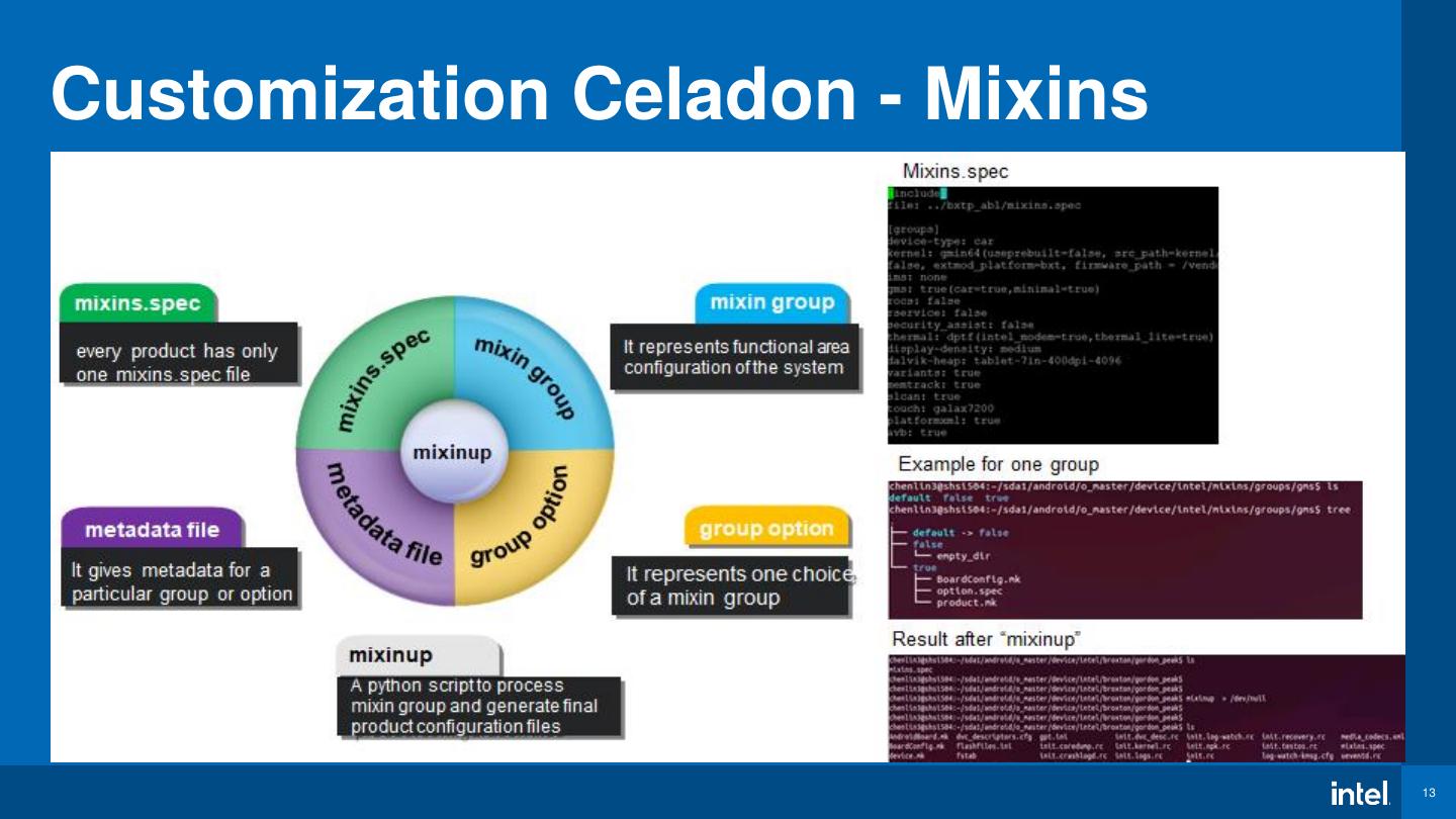 12 .Code Organization ● Maintain Manifest project in Github to include ○ AOSP ○ Intel BSP Projects ● Google diff to cache patch in upstream process ● Mixins to make BSP variants configurable ● Android Auto Adapter Framework to support one image 12