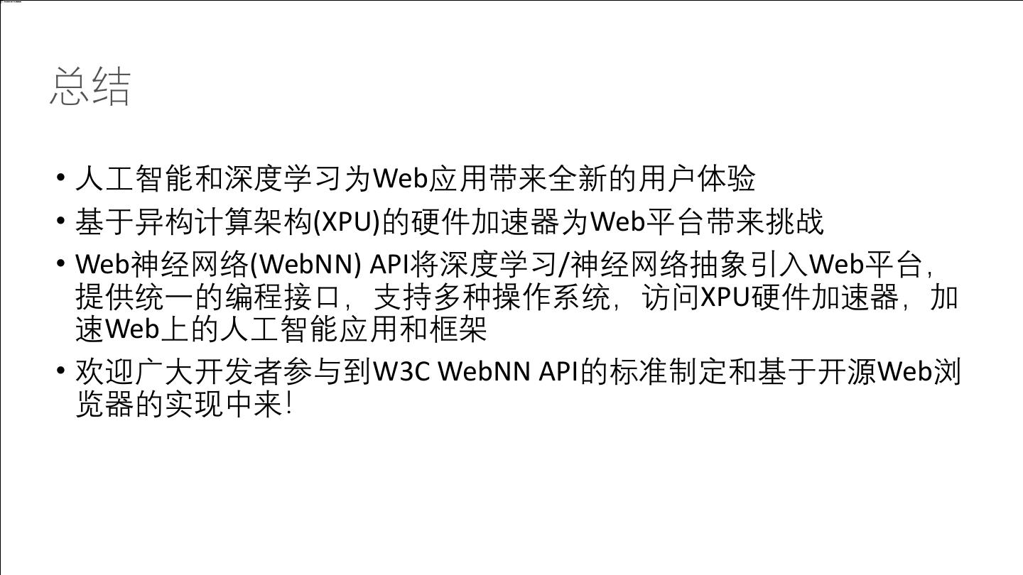 14 .总结 • 人工智能和深度学习为Web应用带来全新的用户体验 • 基于异构计算架构(XPU)的硬件加速器为Web平台带来挑战 • Web神经网络(WebNN) API将深度学习/神经网络抽象引入Web平台, 提供统一的编程接口,支持多种操作系统,访问XPU硬件加速器,加 速Web上的人工智能应用和框架 • 欢迎广大开发者参与到W3C WebNN API的标准制定和基于开源Web浏 览器的实现中来!