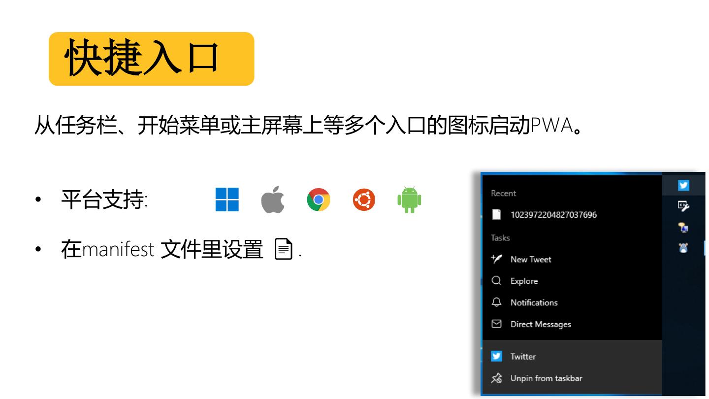 26 . 快捷入口 从任务栏、开始菜单或主屏幕上等多个入口的图标启动PWA。 • 平台支持: • 在manifest 文件里设置 📄. @diekus
