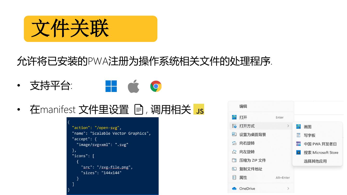 27 . 文件关联 允许将已安装的PWA注册为操作系统相关文件的处理程序. • 支持平台: • 在manifest 文件里设置 📄, 调用相关 @diekus
