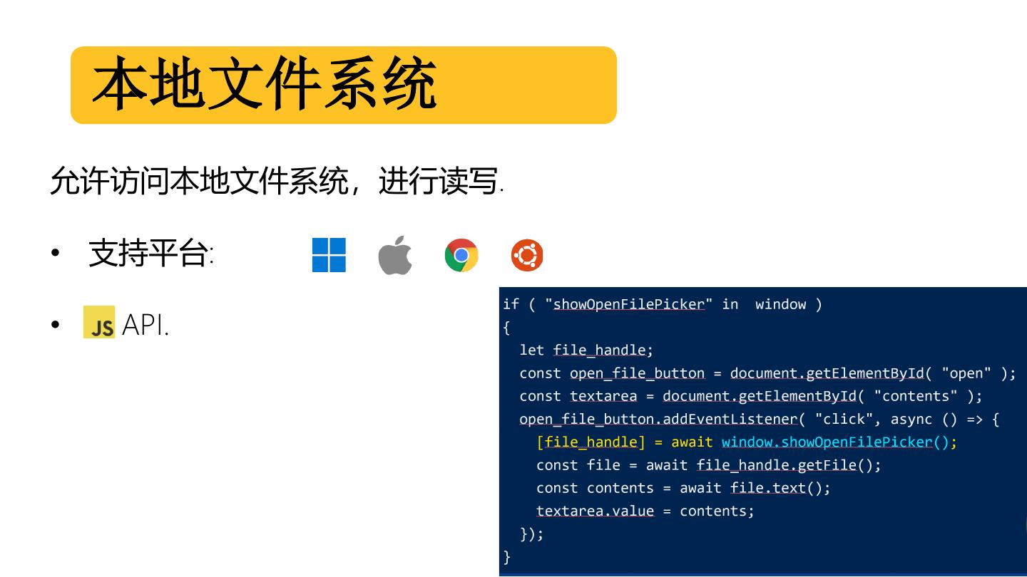28 . 本地文件系统 允许访问本地文件系统,进行读写. • 支持平台: • JS API. @diekus