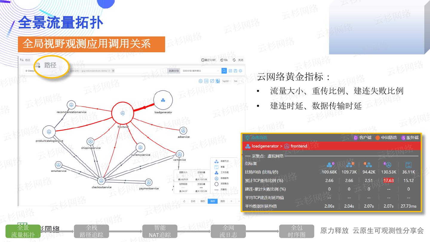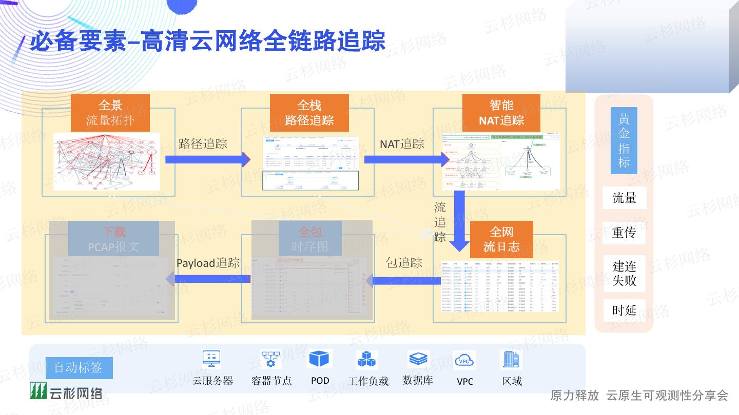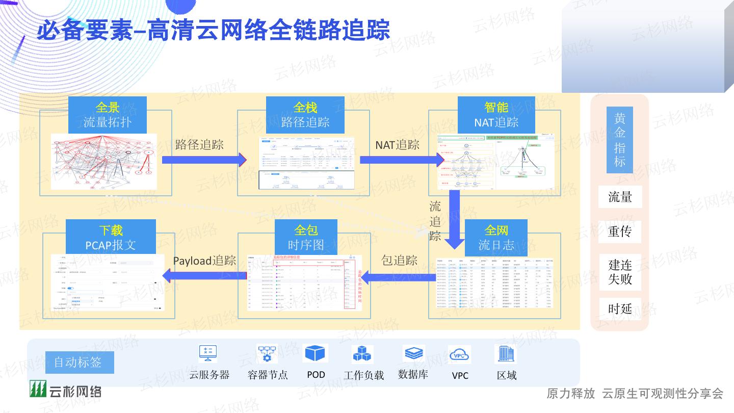 8 .必备要素-高清云网络全链路追踪 全景 全栈 智能 流量拓扑 路径追踪 NAT追踪 黄 金 路径追踪 NAT追踪 指 标 流量 流 追 下载 全包 全网 重传 踪 PCAP报文 时序图 流日志 Payload追踪 包追踪 建连 失败 时延 自动标签 云服务器 容器节点 POD 工作负载 数据库 VPC 区域 原力释放 云原生可观测性分享会