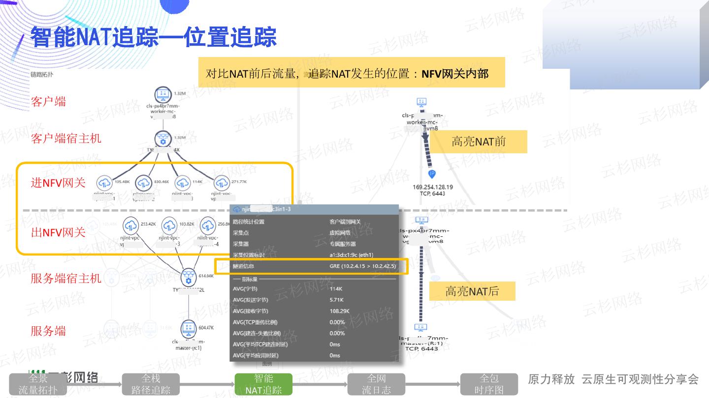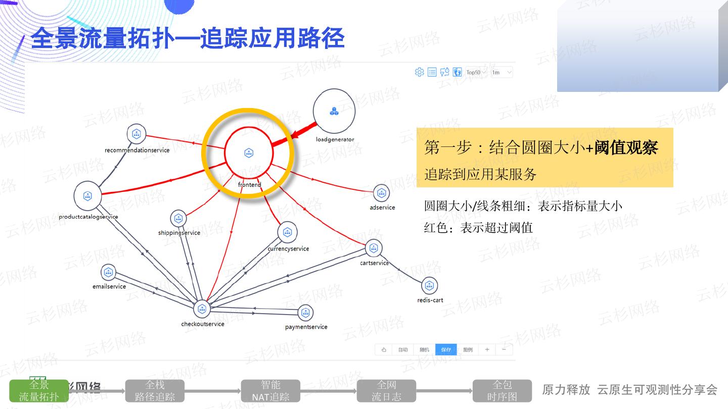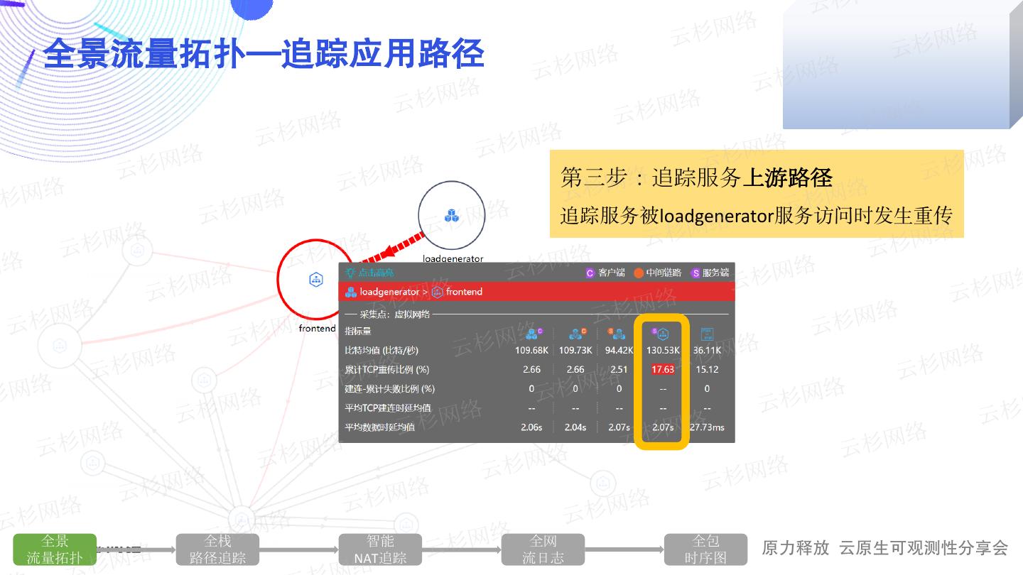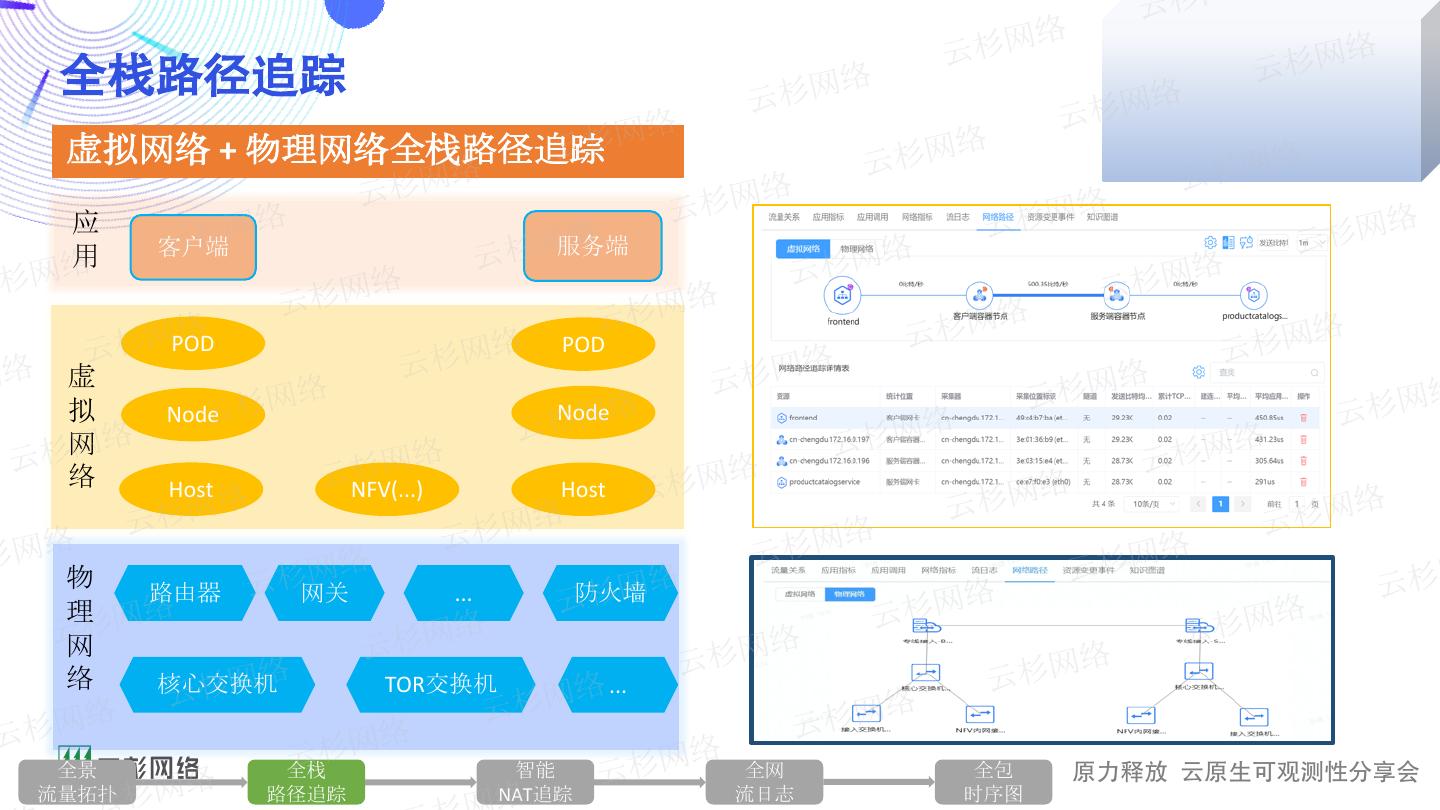 8 .必备要素-高清云网络全链路追踪 全景 全栈 智能 流量拓扑 路径追踪 NAT追踪 黄 金 路径追踪 NAT追踪 指 标 流量 流 追 下载 全包 全网 重传 踪 PCAP报文 时序图 流日志 Payload追踪 包追踪 建连 失败 时延 自动标签 云服务器 容器节点 POD 工作负载 数据库 VPC 区域 原力释放 云原生可观测性分享会