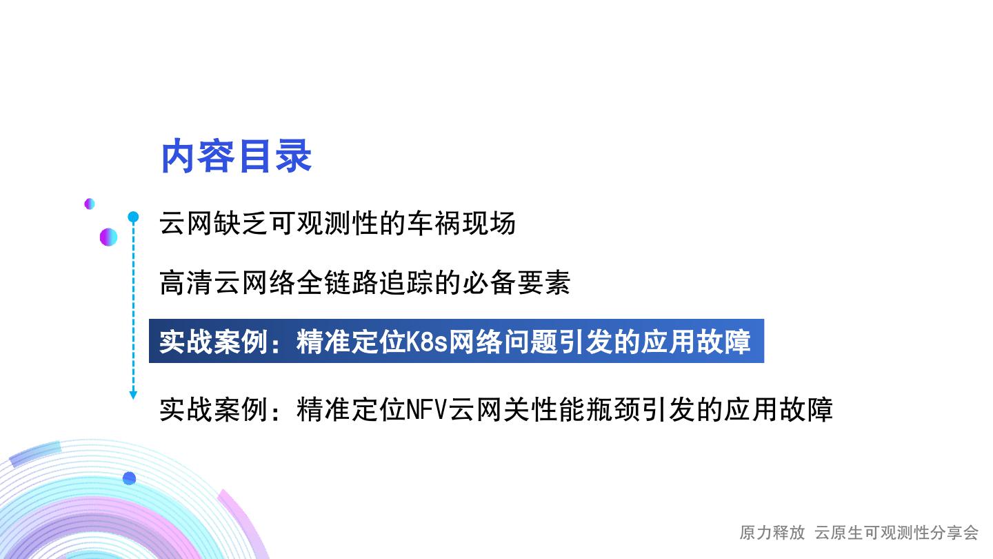 2 .内容目录 云网缺乏可观测性的车祸现场 高清云网络全链路追踪的必备要素 实战案例:精准定位K8s网络问题引发的应用故障 实战案例:精准定位NFV云网关性能瓶颈引发的应用故障 原力释放 云原生可观测性分享会